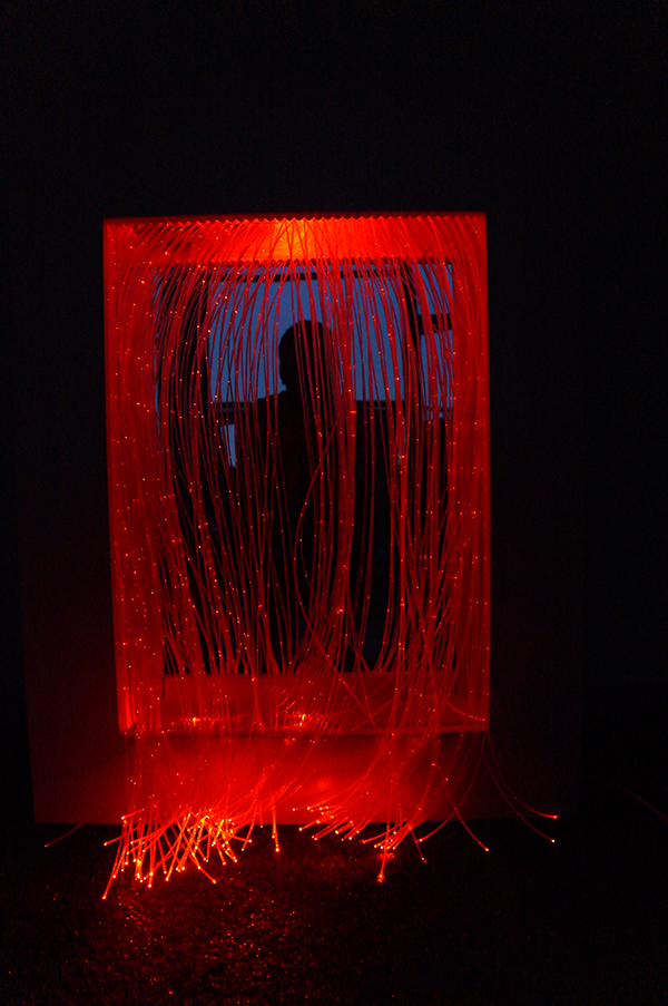 Фибероптические волокна в оболочке на фоне безопасного зеркала. Светодиодный источник света встроен в корпус, нити распределены по всей ширине. Оптоволокно диаметром 2 мм. в оболочке проводит только свет и абсолютно безопасно, его можно перебирать в руках и гнуть в разные стороны.