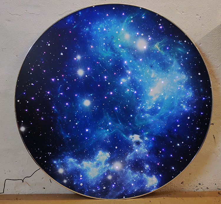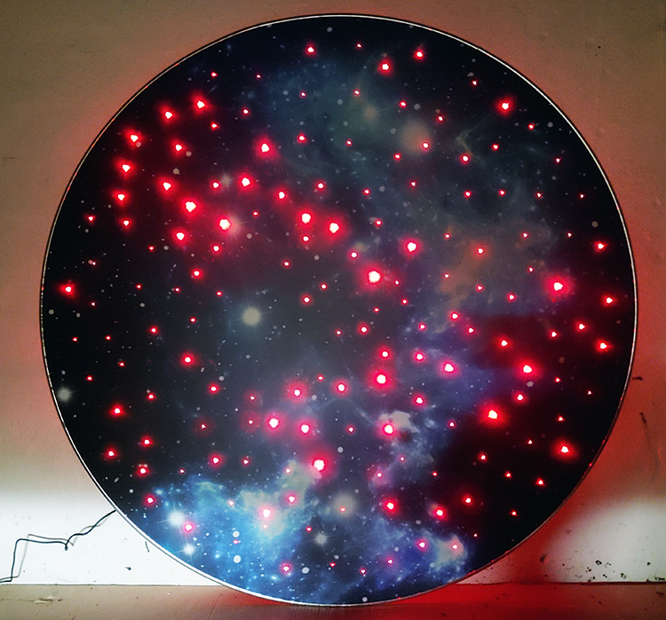 На поверхности панели из алюминиевого композита нанесено изображение звездного неба. При включении возникает эффект мерцающих звезд, переливающихся различными цветами. Разные вариант изображений, можно выбрать при оформлении заказа. Удобное потолочное крепление с регулируемой высотой подвеса.