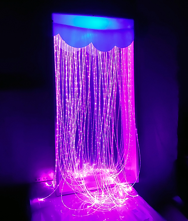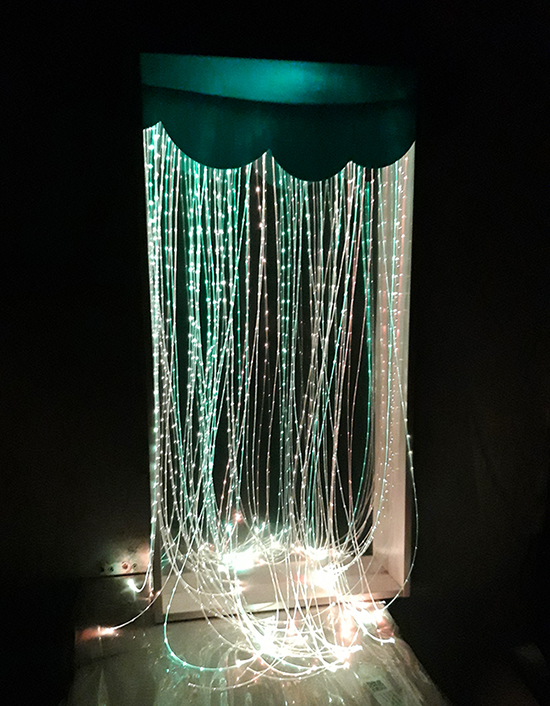 Настенное отражающее панно в деревянном корпусе. На фоне небьющегося зеркала проходят фибероптические волокна. Каждое волокно в безопасной силиконовой оболочке. Предназначено для стимуляции зрительного нерва, создания расслабляющего эффекта, стимулирования тактильных ощущений.