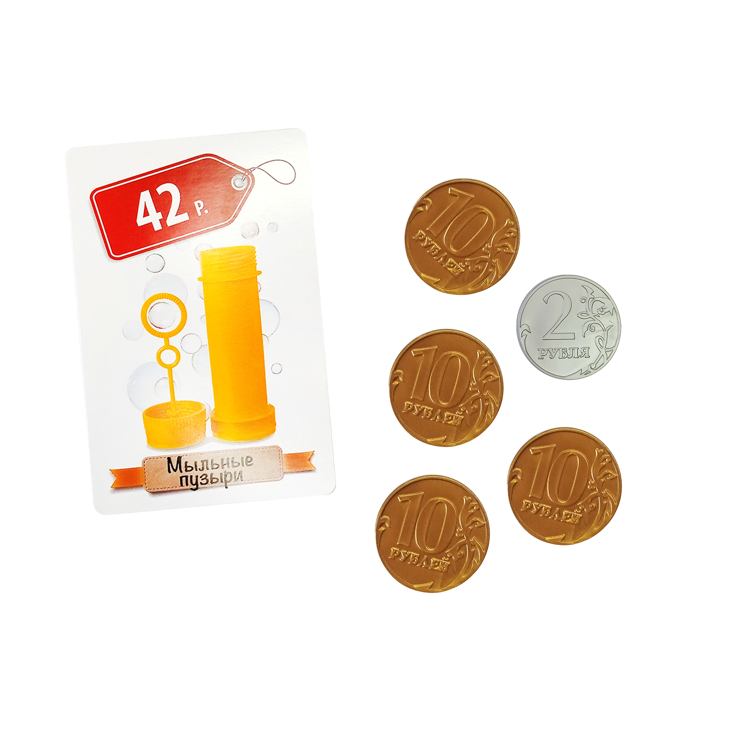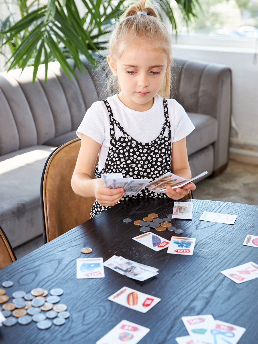 Настольная игра «Денежка. Без сдачи» из серии «Игры в табакерке» поможет познакомить ребёнка со всеми разновидностями монет Российской Федерации и научит рациональному использованию денег. Состав игры: карточки товаров с ценниками – 14 шт. (5,5 х 8,4 см), игральный кубик с изображёнными на гранях номиналами монет – 1 шт. (1,5 х 1,5 см), монеты 1, 2, 5, 10 руб. – 52 шт. (размеры приближены к натуральным), правила игры. Материалы: картон, пластмасса, жесть. Игра хранится в компактной жестяной коробочке размером 9 х 9 см. Развивает математические способности, учит обращаться с деньгами, вести счёт.