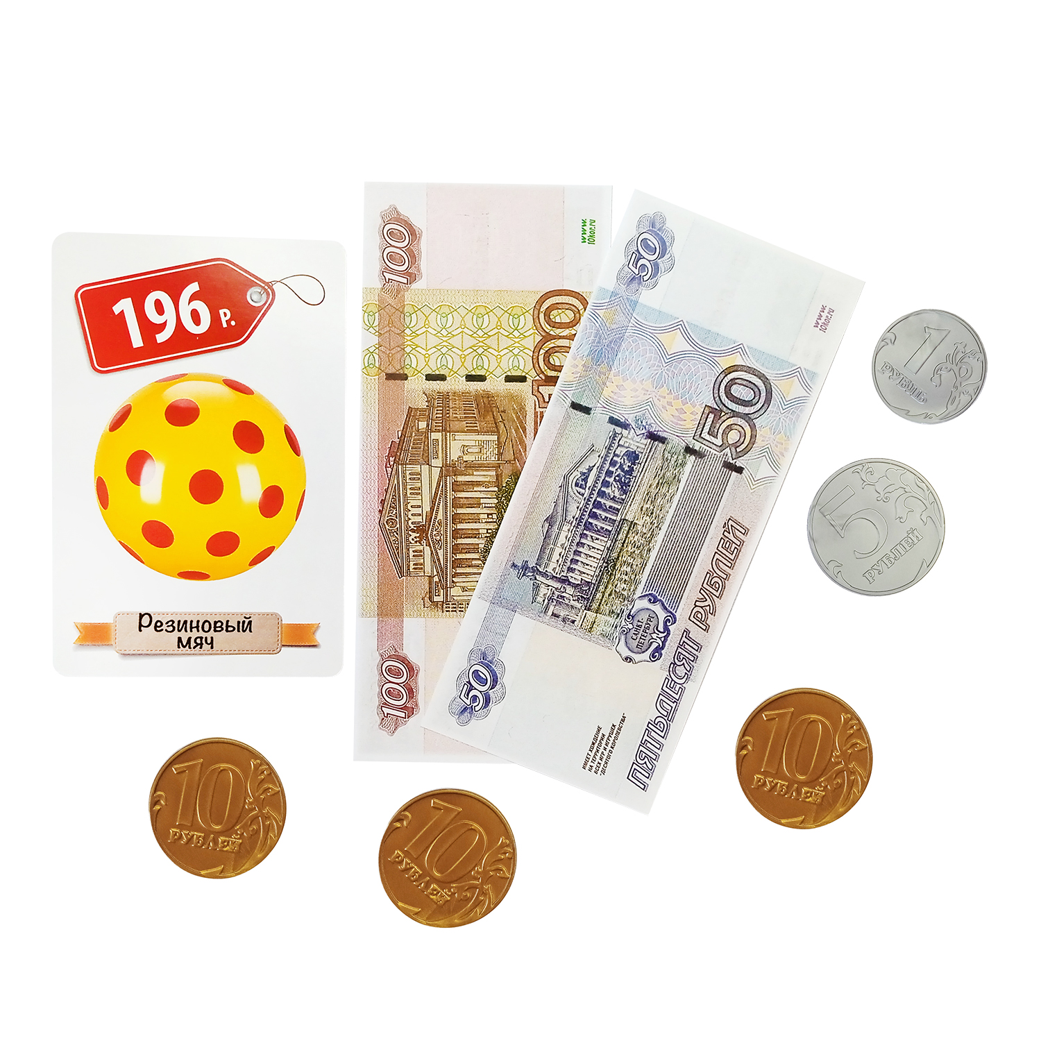 Настольная игра «Денежка. Играем в магазин. Покупаем всякую всячину». Для детей от 4 до 6 лет. Состав: монеты – 80 шт. (диаметр от 21 до 25 мм), копии банкнот – 54 шт., двусторонние карточки с продуктами – 14 шт. (55 х 85 мм), правила игры. Материалы: пластмасса, бумага, картон. Игра поможет научить ребёнка обращаться с деньгами, проверять правильность выданной ему в магазине сдачи, а также поможет в развитии логики, внимательности и навыков счета в уме.