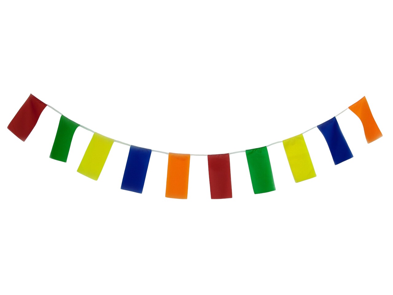 Флажная лента — это ряд прямоугольных разноцветных флажков (5 цветов – синий, красный, желтый, зеленый, оранжевый), пришитых к шнуру. 40 см шнура с каждой стороны – завязки.