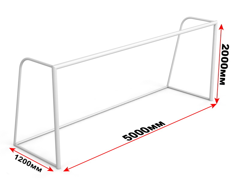 Размеры (внутренние): 2х5м, глубина 1,0/1,2м. Круглый стальной профиль диаметром 89мм. (в соответствии с ГОСТом) с безопасными петлями для крепления сетки. Ворота представляют собой цельносварную или сборную конструкцию, состоящую из боковин, которые крепятся между собой перекладинами, с помощью болтовых соединений. Для установки на улице требуется приобретать комплект стаканов. Задняя рама ворот изготавливается из круглого профиля диаметром 32 мм. Конструкция окрашена белой порошковой краской.