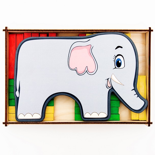 Фигурка слона и около 30 деталей, деревянных палочек - брусочков, деревянная коробочка для хранения деталей. Брусочки единого размера, но разных цветов: зелёные, жёлтые, красные. Базовые цвета, необходимые для усвоения дошкольников. Деревянную коробочку, в которой лежит игра, можно использовать как материал для новой игры, разбирать и собирать, тренируя мелкую моторику и логику.