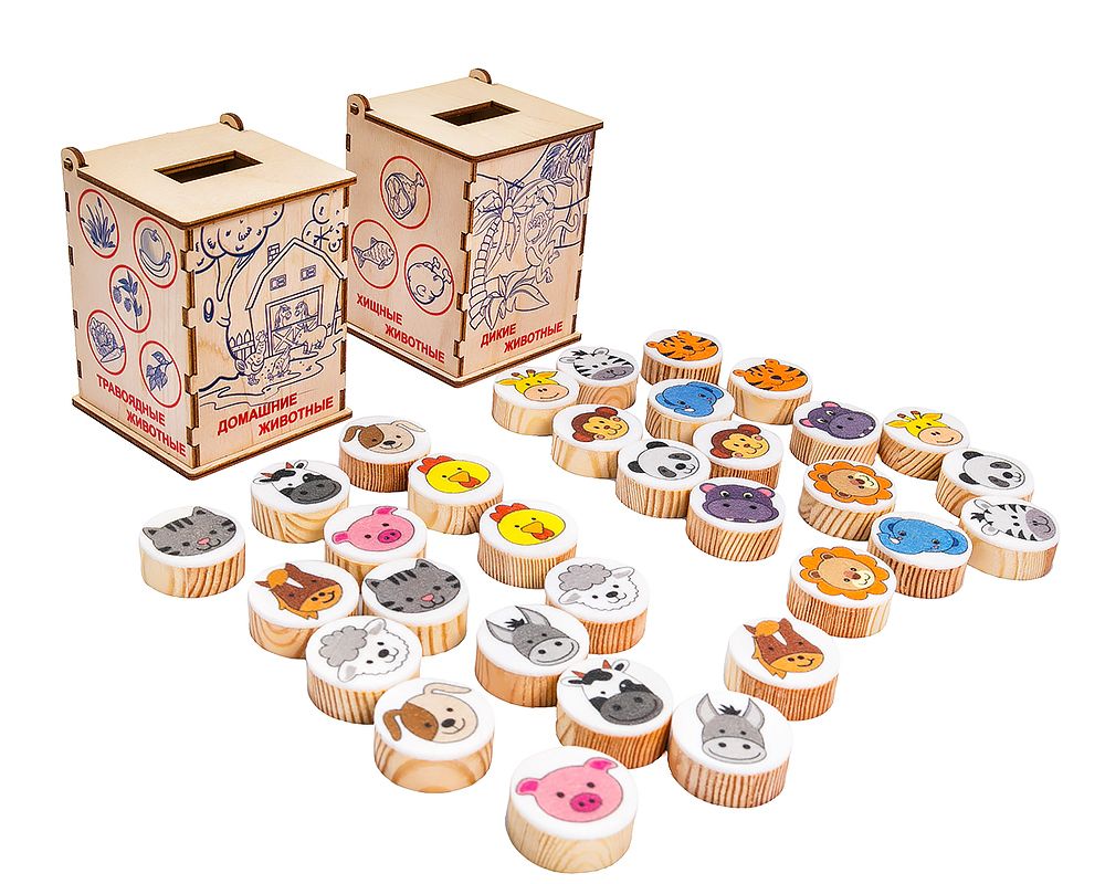 3. Расскажите ребенку о домашних и диких животных. Попросите малыша «расселить» всех животных, сортируя фишки по соответствующим коробкам.