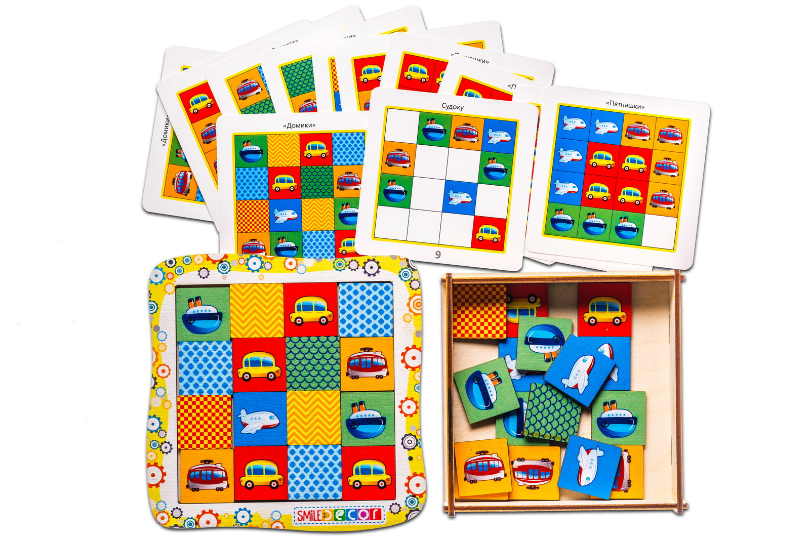 3. Игра «Судоку». Выберите одну из карточек «Судоку» и разложите фишки на игровом поле по образцу на карточке. Затем предложите ребенку заполнить все игровое поле фишками так, чтобы в каждом столбце и в каждой строке фишка с изображением одного и того же транспорта встречалась только один раз.