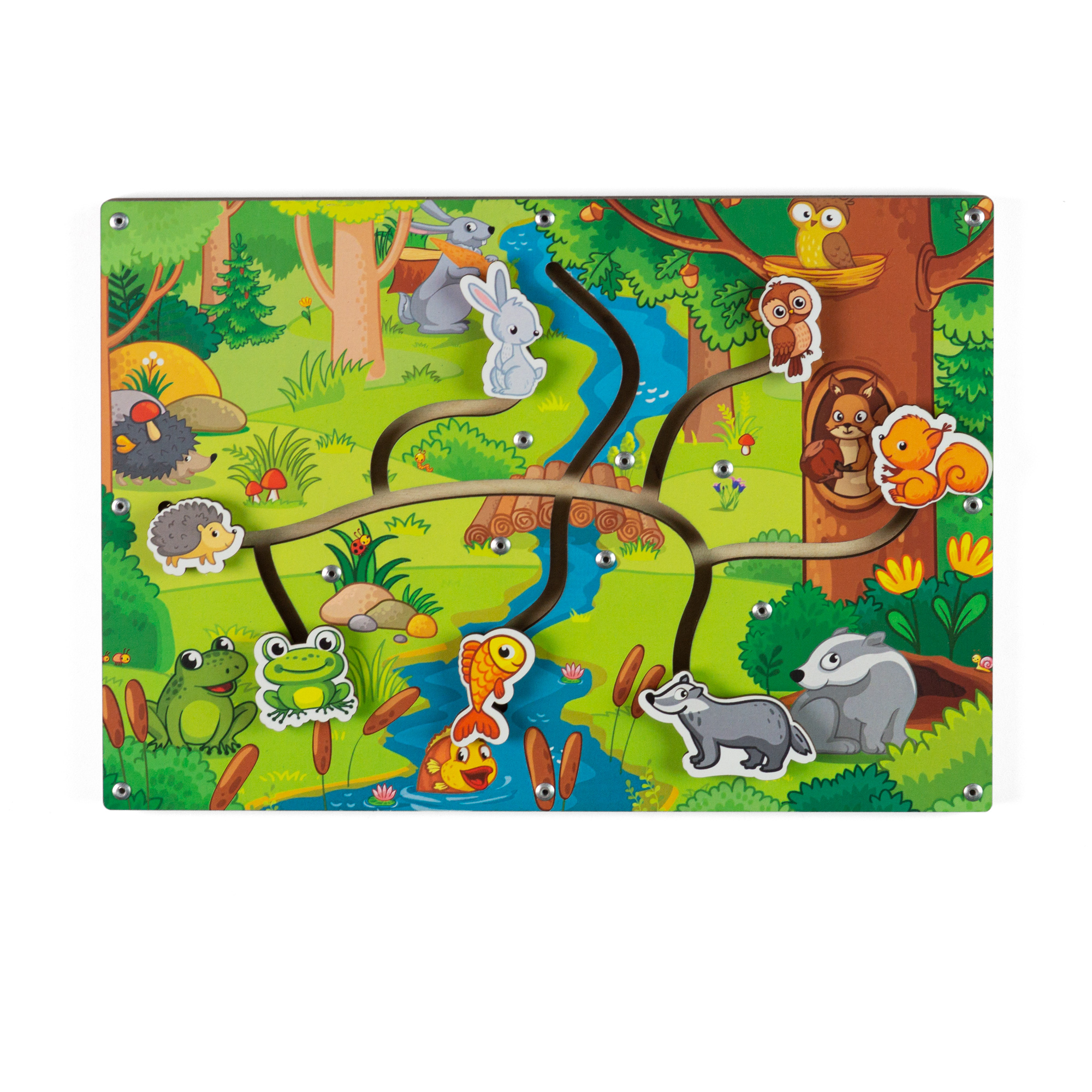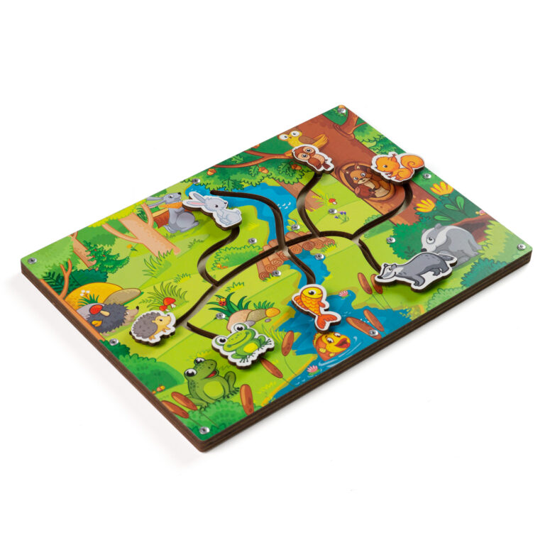 Сортер – лабиринт представляет собой деревянную панель с изображением леса и его обитателей: ежа, лягушки, зайчика, совы, белки, рыбки в лесном пруду, бурундука. На штангах изображены – детеныши животных. Прорези - дорожки для их передвижения.