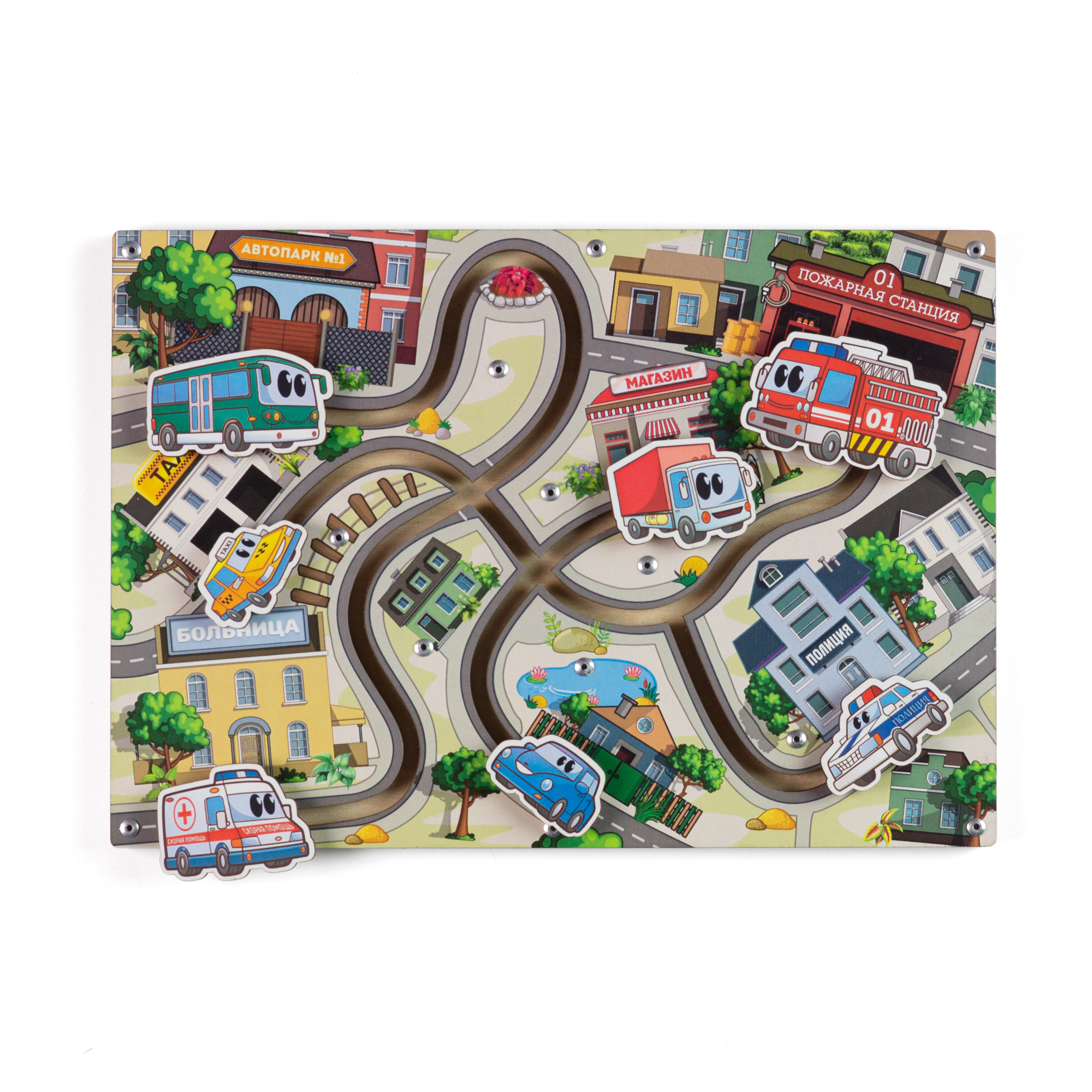 Сортер – лабиринт Городские машинки представляет собой деревянную панель с изображением города: улиц, домов, пожарной станции, магазина, полиции, больницы, автопарка и такси. Улицы представляют собой прорези – дорожки (лабиринт), по которым передвигаются машины.