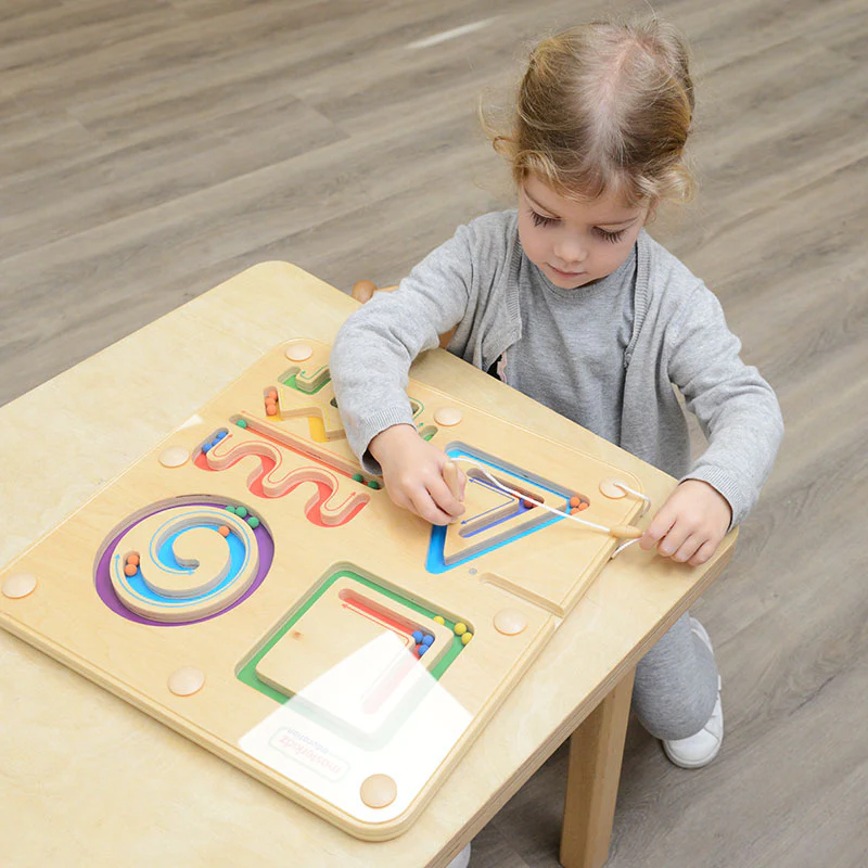 На панели представлены 7 лабиринтов, магнитный стержень на веревочке и набор магнитных шариков.