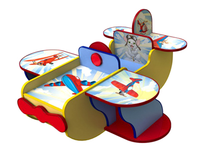 Игровая зона «Самолёт». Выполнен из ламинированной ДСП (ЛДСП) 16 мм, обрамлен кантом ПВХ 2 мм, все углы закруглены. Самолёт оснащен всей необходимой атрибутикой, включая вращающиеся штурвал, пропеллер и сидения. Самолёт прекрасно подойдет для сюжетно-ролевых игр. Также во время игры закрепляются знания о воздушных видах транспорта, пополняется словарный запас – штурвал, пропеллер, хвостовая часть, крылья, пилот, пассажиры. Цвет на выбор. Возможно изготовление с фотопечатью.