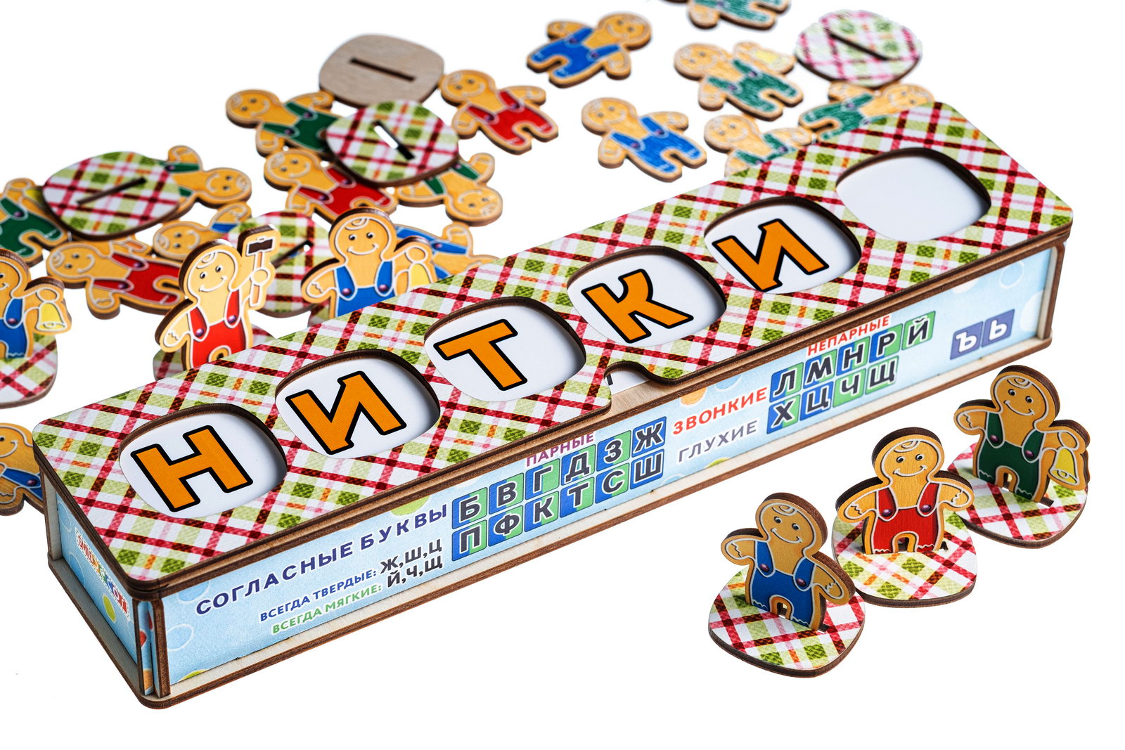 6. Игра «Грамотейка». Предложите ребенку вставить одну из карточек со словами в крышку коробки, прочитать слово и выложить звуковую схему данного слова с помощью Звуковичков. Например, схема слова КНИГА выглядит так: синий Звуковичок (твердый глухой согласный) – зеленый Звуковичок со звоночком (мягкий звонкий согласный) – красный Звуковичок с молоточком (гласный ударный) – синий Звуковичок со звоночком (твердый звонкий согласный) – красный Звуковичок (гласный).