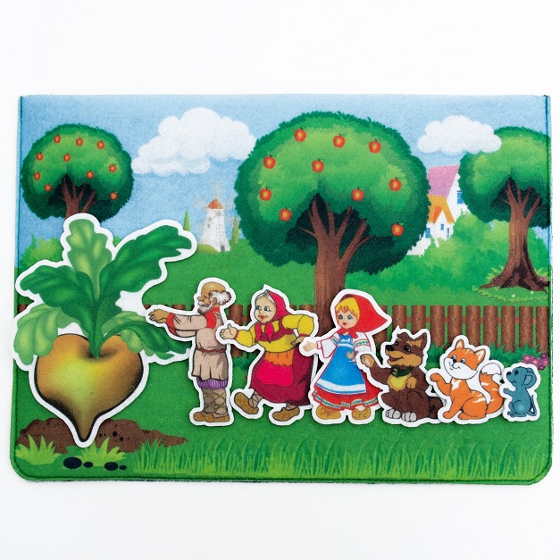 Фетровый конверт с изображением огорода с забором. Фигурки из фетра с ли: репка, дед, баба, внучка, собака жучка. Геометрические фигуры: круг 4 см. желтый, круг 6 см. красный, квадрат 3 см. зеленый, квадрат 4 см. желтый, прямоугольник 3*6 синий, прямоугольник 4*7 зеленый, треугольник 4 см. красный, треугольник 5 см. синий.