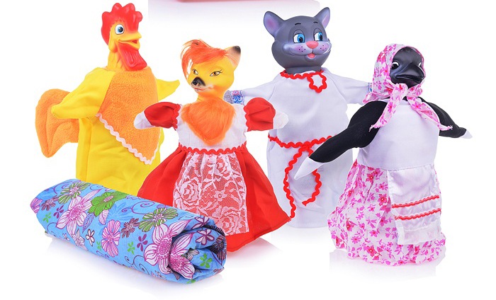 В комплект кукольного театра 4 персонажа с ширмой входят 4 перчаточные куклы, с которыми можно разыгрывать кукольные спектакли: Петух, Лиса, Сорока, Кот.