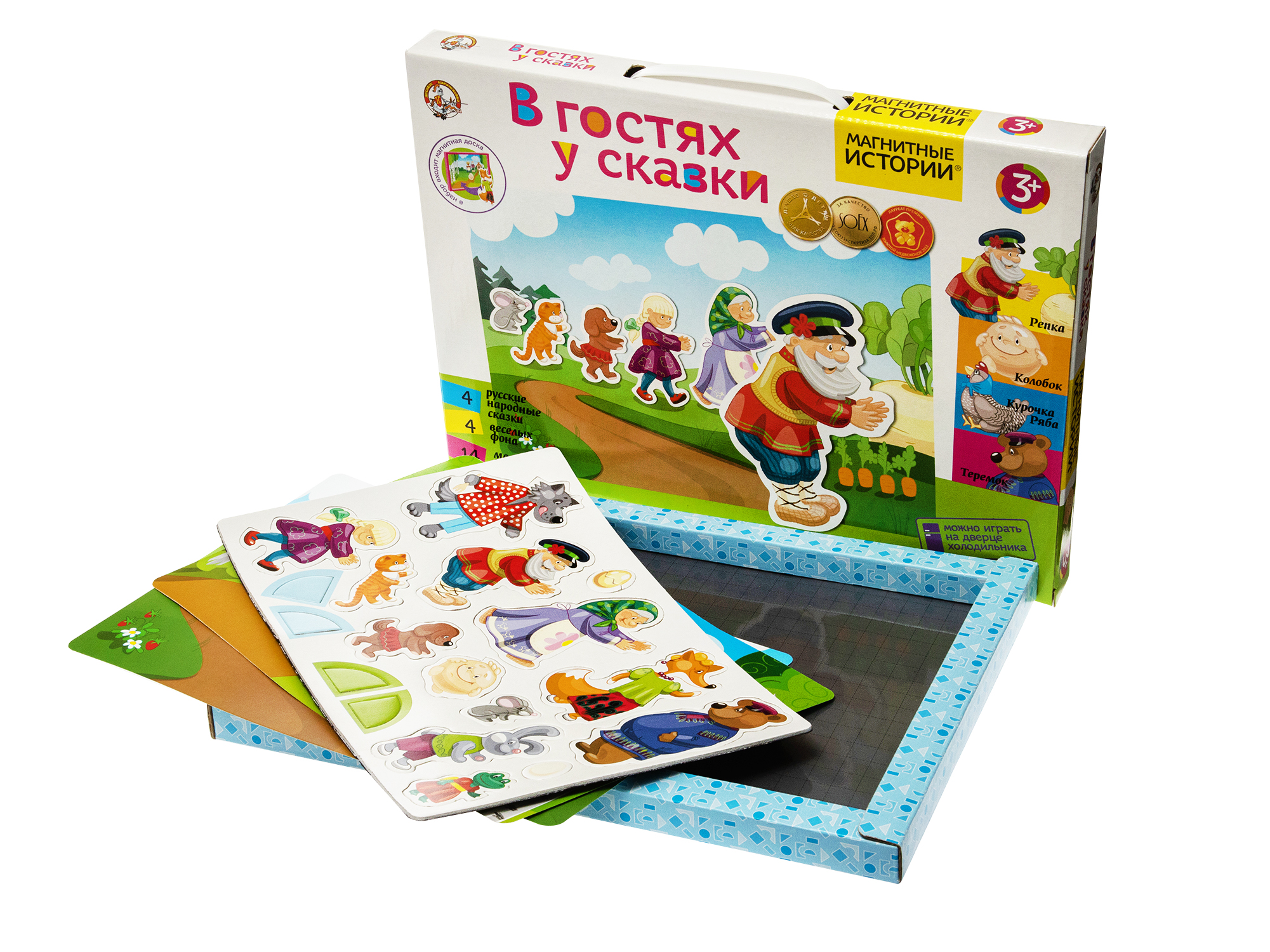 Магнитная развивающая игра «В гостях у сказки». Состав: магнитный планшет (35,5 х 25 х 2 см), двухсторонние игровые поля – 2 шт., магнитные фигурки – 14 шт. (высота – от 2,5 до 11 см), магнитные уголки для фиксации полей – 4 шт. (высота – 2,5 см). Материалы: картон, полимерный материал, магнитный винил, металл. Персонажи и фоны позволяют играть 4 русские народные сказки: Репку, Теремок, Колобок и Курочку Рябу.