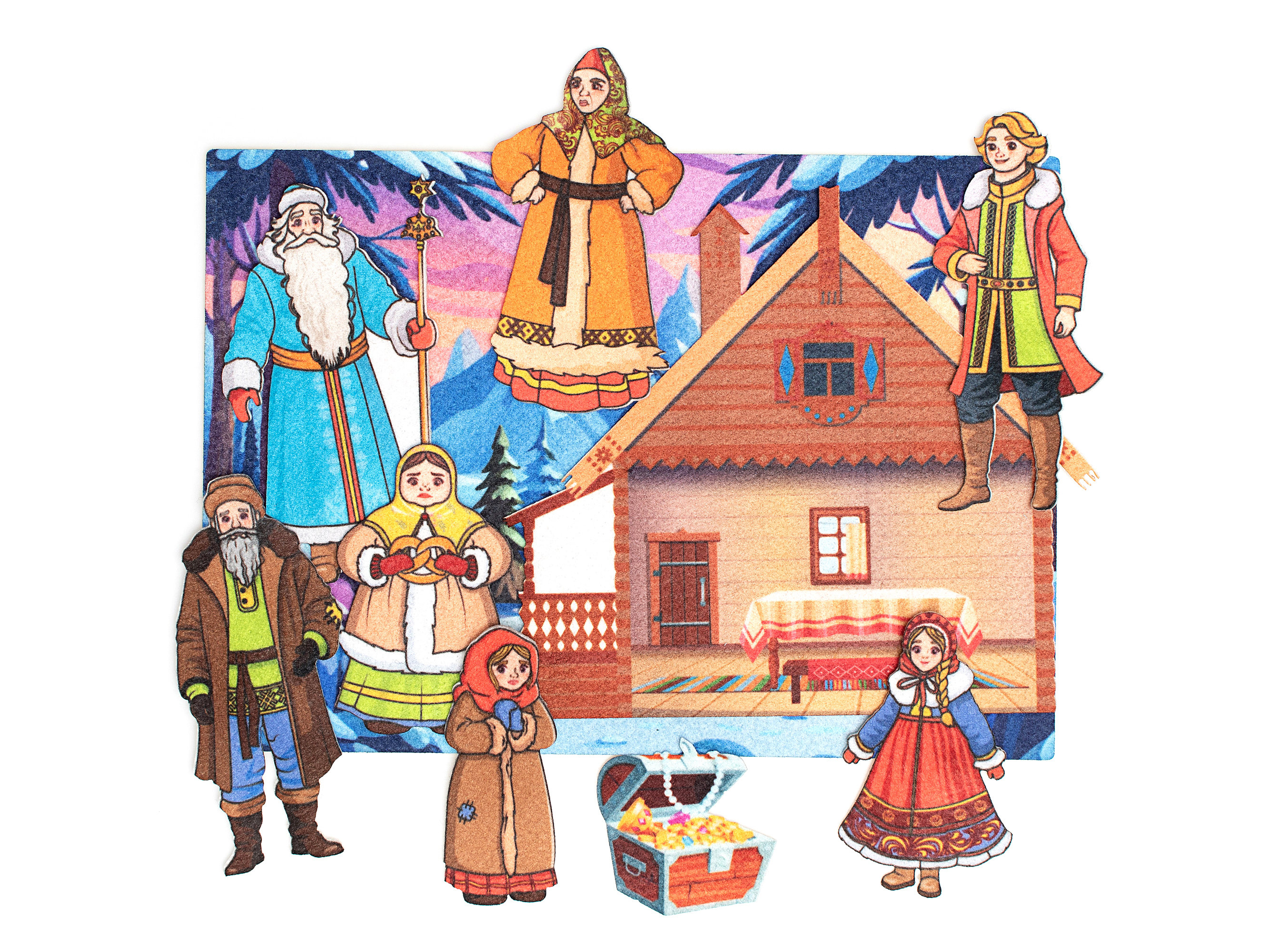 Игровое поле с карманом 28*20см. Фигурки героев сказки: Настенька, Дед Мороз, Отец, Мачеха, Марфуша, Изба, сундук. Фигурки от 10х4,5 до 13х15 см.
