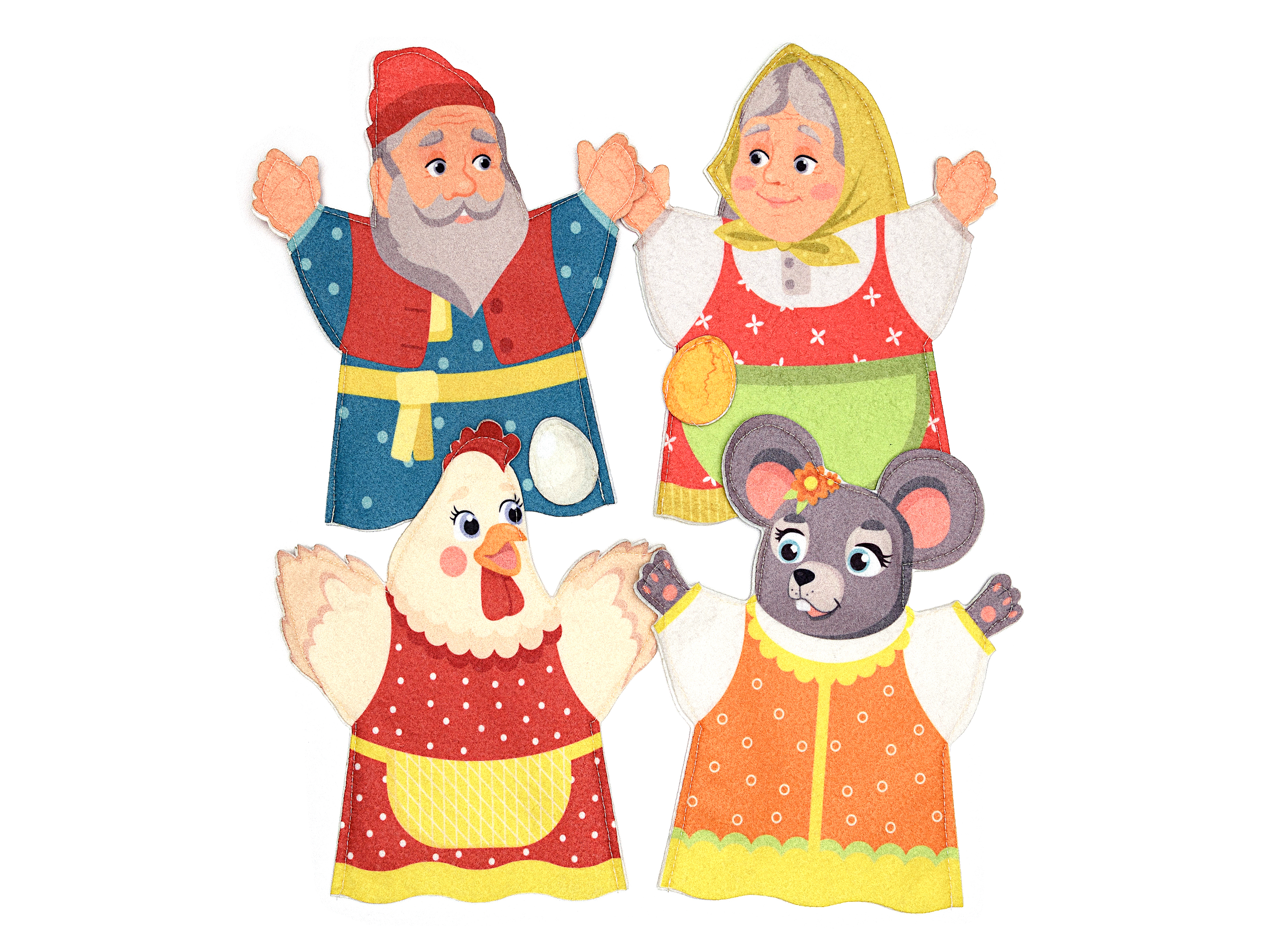 Четыре персонажа из сказки курочка ряба на руку 23см. Дед,бабка,курочка Ряба, мышка + яичко золотое и простое пальчиковый театр.
