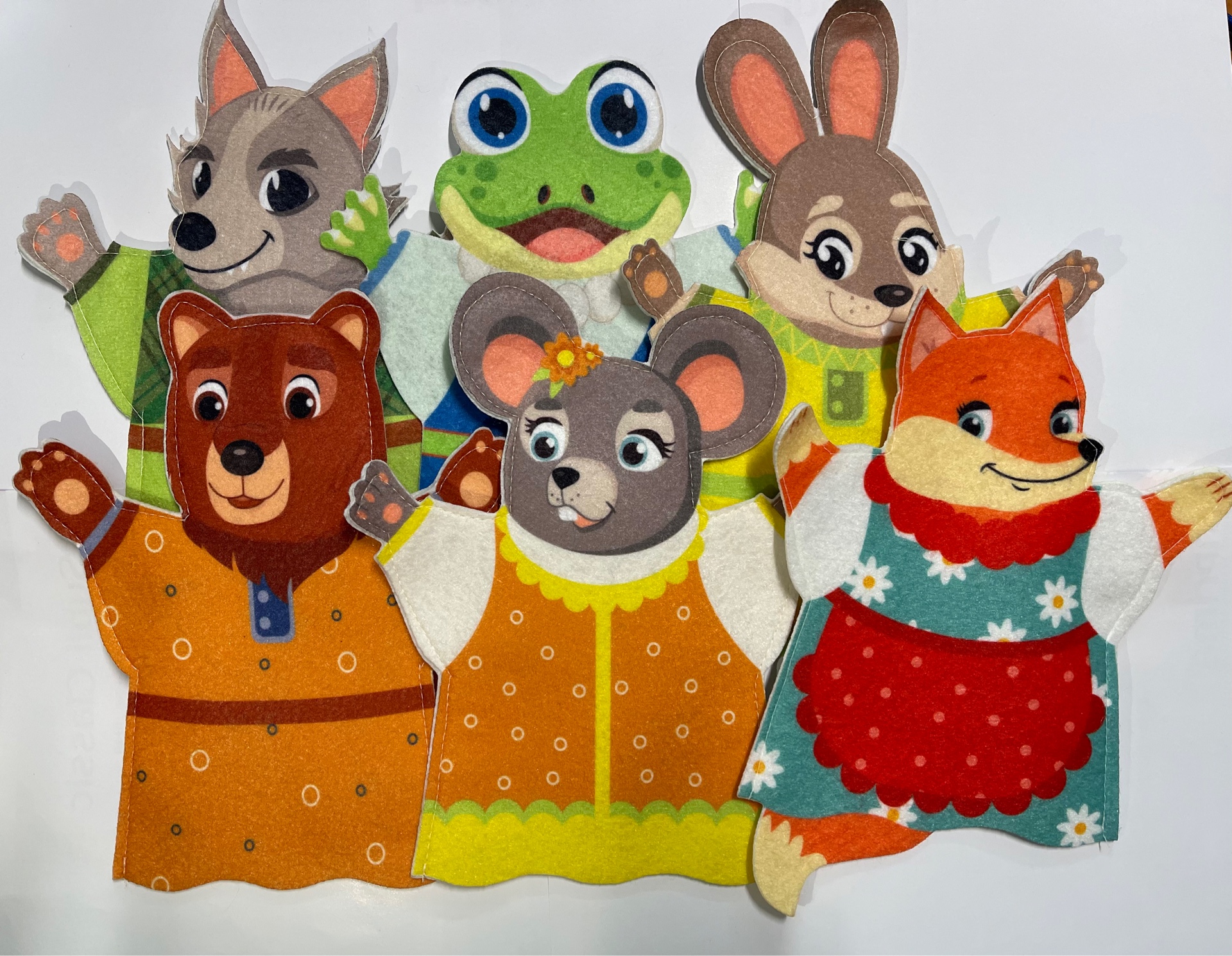 Шесть персонажей из сказки теремок на руку. Лягушка, волк, лиса, медведь, заяц, мышка. Фигурки 23см.