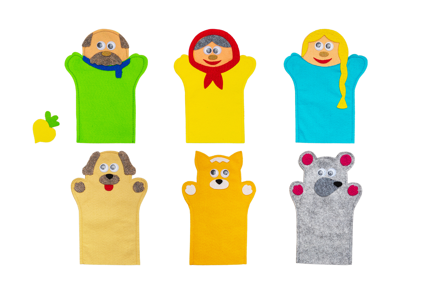 Шесть персонажей из сказки репка на руку 26см. Бабка, дедка, внучка, собака, кошка, мышка + репка пальчиковый театр.