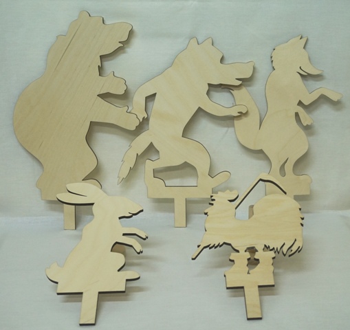 Перед вами теневой театр «Заюшкина избушка». Персонажи: заяц, лиса, волк, медведь, петух.