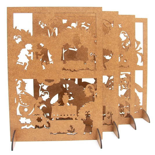 Деревянные пластины формата А4 с изображением сценки из сказки Муха-Цокотуха на одной пластине две сценки. В одной сказке 4 пластины.