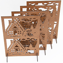 Деревянные пластины формата А4 с изображением сценки из сказки Теремок на одной пластине две сценки. В одной сказке 4 пластины.