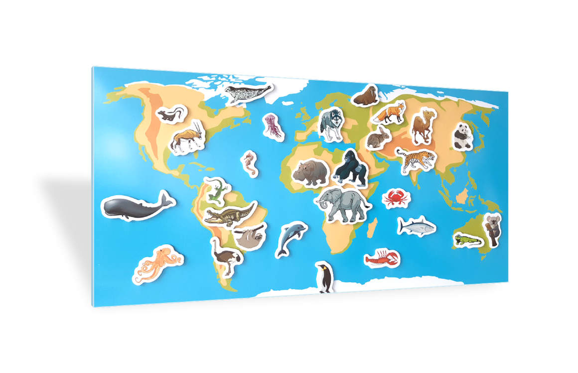 Дидактическая доска танет функциональным дополнением в детском саду, в кабинете начальной школы, географии или биологии. На доске изображена карта, а в комплекте к ней идут магниты с изображениями животных (80 шт), что позволит изучить не только животных, но и места их обитания.