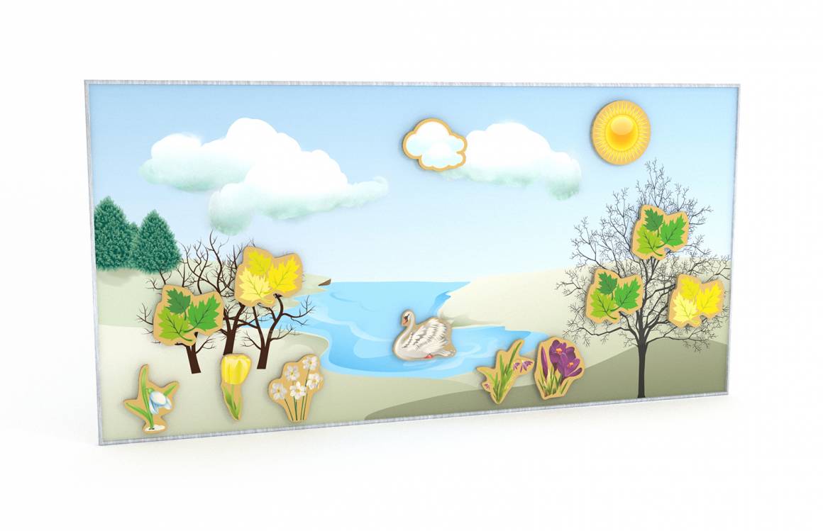 Дидактическая доска используется на занятиях по изучению природы и экологии, по развитию речи, математике и логопедии. Магнитная доска выполнена из фанеры с полимерной магнитной пленкой. Дидактический материал тоже из фанеры и состоит из 98 элементов на 5 тем : природные явления - 20 шт, смена сезонов на деревьях, озере, доме и земле - 28 шт, цветы и грибы" - 15 шт, птицы - 15 шт, животные - 20 шт.