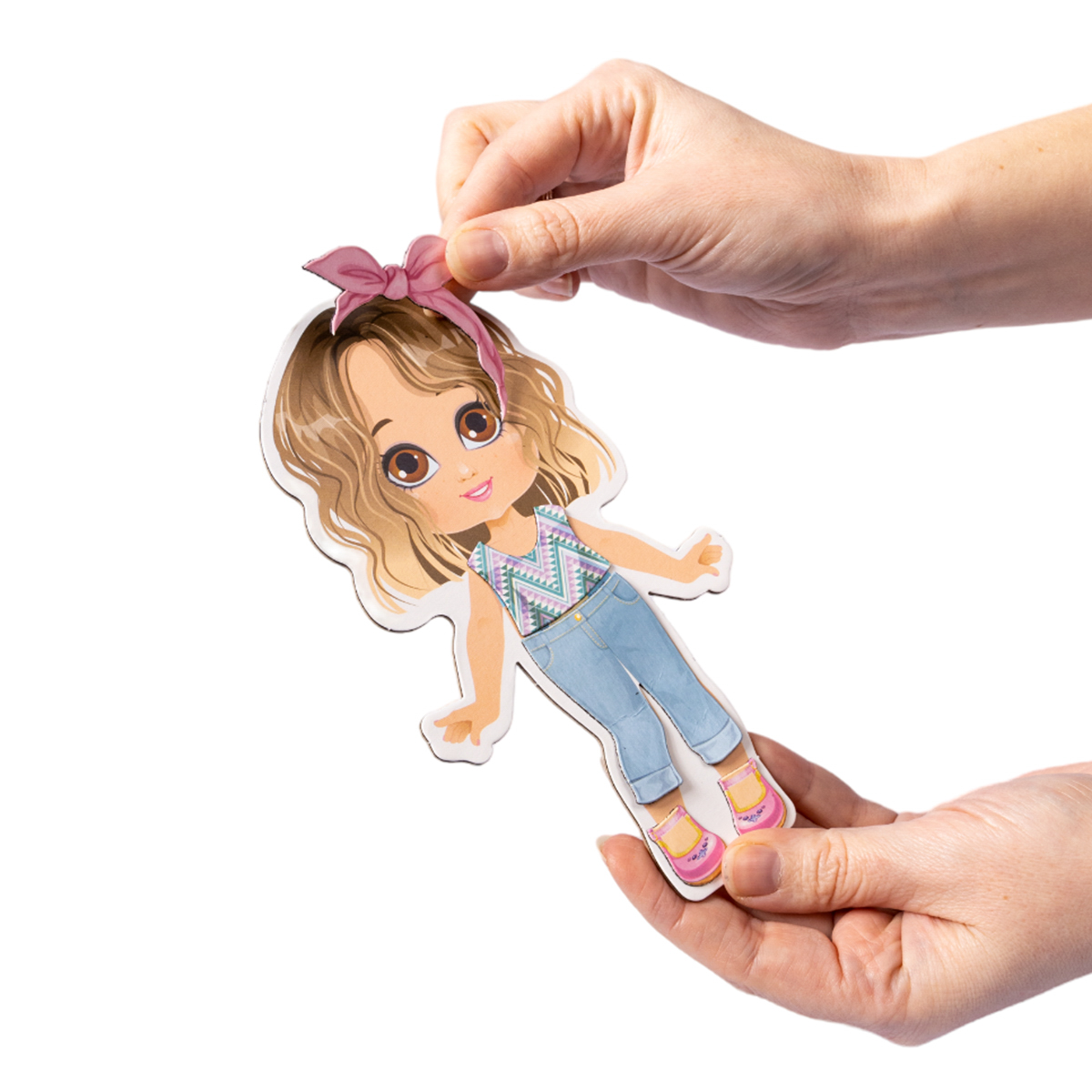 Магнитная игра «Одевашки. Модная девчонка. Ксюша». 3+. Состав: кукла Ксюша из мягкого железа – 1 шт. (18 х 9 см), магниты – 37 шт. Материалы: магнитомягкое железо, магнит, картон. Кукла не магнитная и не крепится к металлическим объектам. Магнитные элементы крепко держатся на поверхности куклы и легко убираются. Игра поможет научить ребёнка одеваться по случаю и по погоде, а также поможет в развитии мелкой моторики, логики и фантазии.