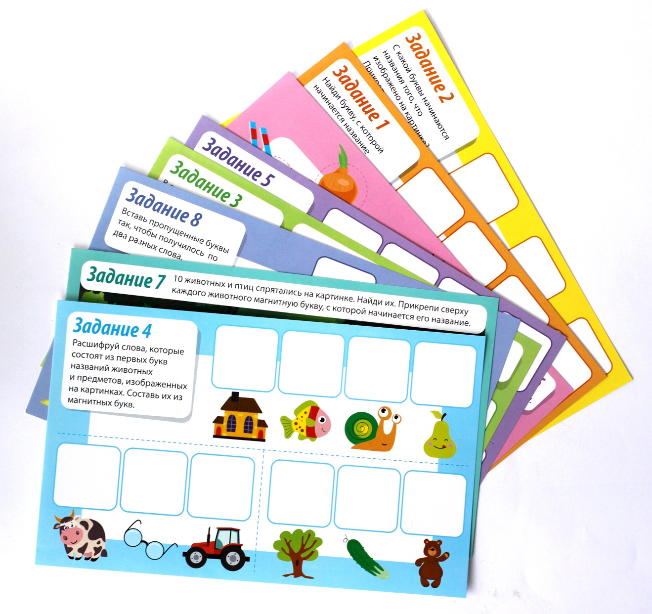 Магнитная обучающая игра «Азбука с заданиями» для детей от 3 лет. Европодвес. Состав игры: двухстороннее магнитное игровое поле (23,5 х 14,7 см), карточки с заданиями – 8 шт. (22,5 х 13,7 см), магнитные буквы – 62 шт. (высота – 3 см). Материалы: магнит, магнитомягкое железо, картон. На голубой стороне игрового поля изображены силуэты букв в алфавитном порядке. Зелёная сторона поля предназначена для свободного пользования. Задания, входящие в комплект, направлены на разностороннее знакомство с азбукой: предлагается найти букву, с которой начинается название изображаемого объекта, разобрать длинное слово на несколько маленьких, вставить пропущенные буквы или разгадать кроссворд. Игра развивает навык владения алфавитом и русским языком, тренирует мелкую моторику, логику.