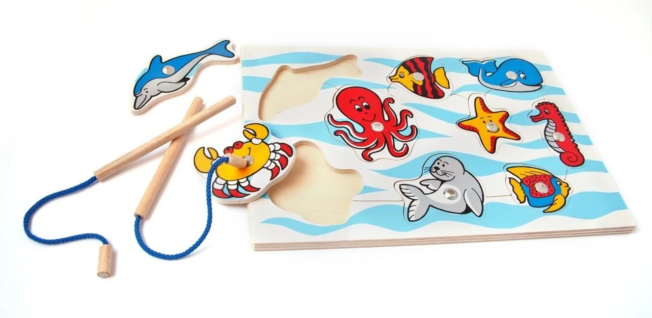 Деревянный планшет с вкладышами, на которых изображены морские животные. Количество вкладышей 9 штук. Для интересного времяпровождения добавлены 2 удочки. Ваш малыш познакомится как с морскими животными, так и с элементами рыбалки.