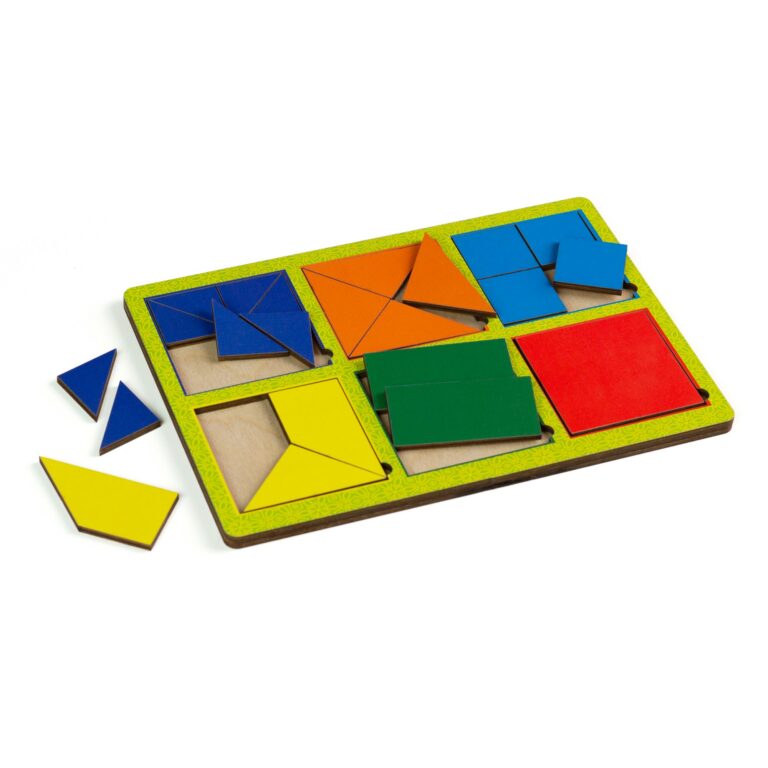 Деревянная панель с рамками - квадратами– 1 шт. Панель содержит 3 квадрата, разных цветов (голубой, красный, зеленый), разделенных на 4 части разным способом и 8 частей.