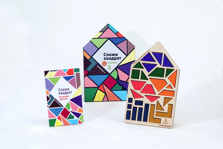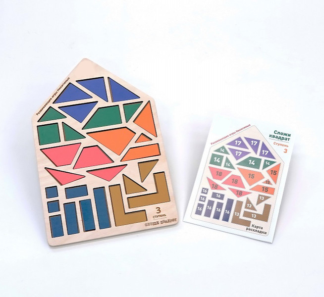 Новое исполнение одной из самых популярных игр Никитиных. Ступень 3 (2 уровень сложности). 6 разноцветных квадратов-головоломок, разрезанных разными способами на 4 и более частей. Деревянный планшет - "домик" - это методически правильная упаковка, где фрагменты квадратов хранятся в разобранном виде. В комплект входит подробная авторская инструкция-методика для родителей и педагогов, картонный пенал для хранения и карта раскладки с нумерацией заданий.