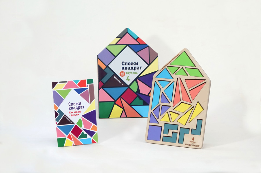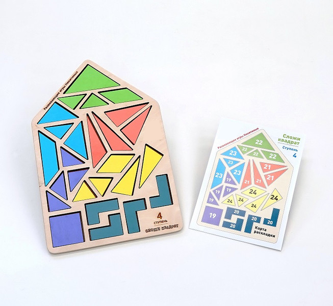 Новое исполнение одной из самых популярных игр Никитиных. Ступень 4 (2 уровень сложности). 6 разноцветных квадратов-головоломок, разрезанных разными способами на 4 и более частей. Деревянный планшет - "домик" - это методически правильная упаковка, где фрагменты квадратов хранятся в разобранном виде. В комплект входит подробная авторская инструкция-методика для родителей и педагогов, картонный пенал для хранения и карта раскладки с нумерацией заданий.