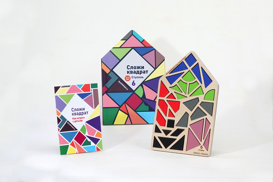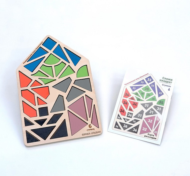 Новое исполнение одной из самых популярных игр Никитиных. Ступень 6 (3 уровень сложности). 6 разноцветных квадратов-головоломок, разрезанных разными способами на 4 и более частей. Деревянный планшет - "домик" - это методически правильная упаковка, где фрагменты квадратов хранятся в разобранном виде. В комплект входит подробная авторская инструкция-методика для родителей и педагогов, картонный пенал для хранения и карта раскладки с нумерацией заданий.