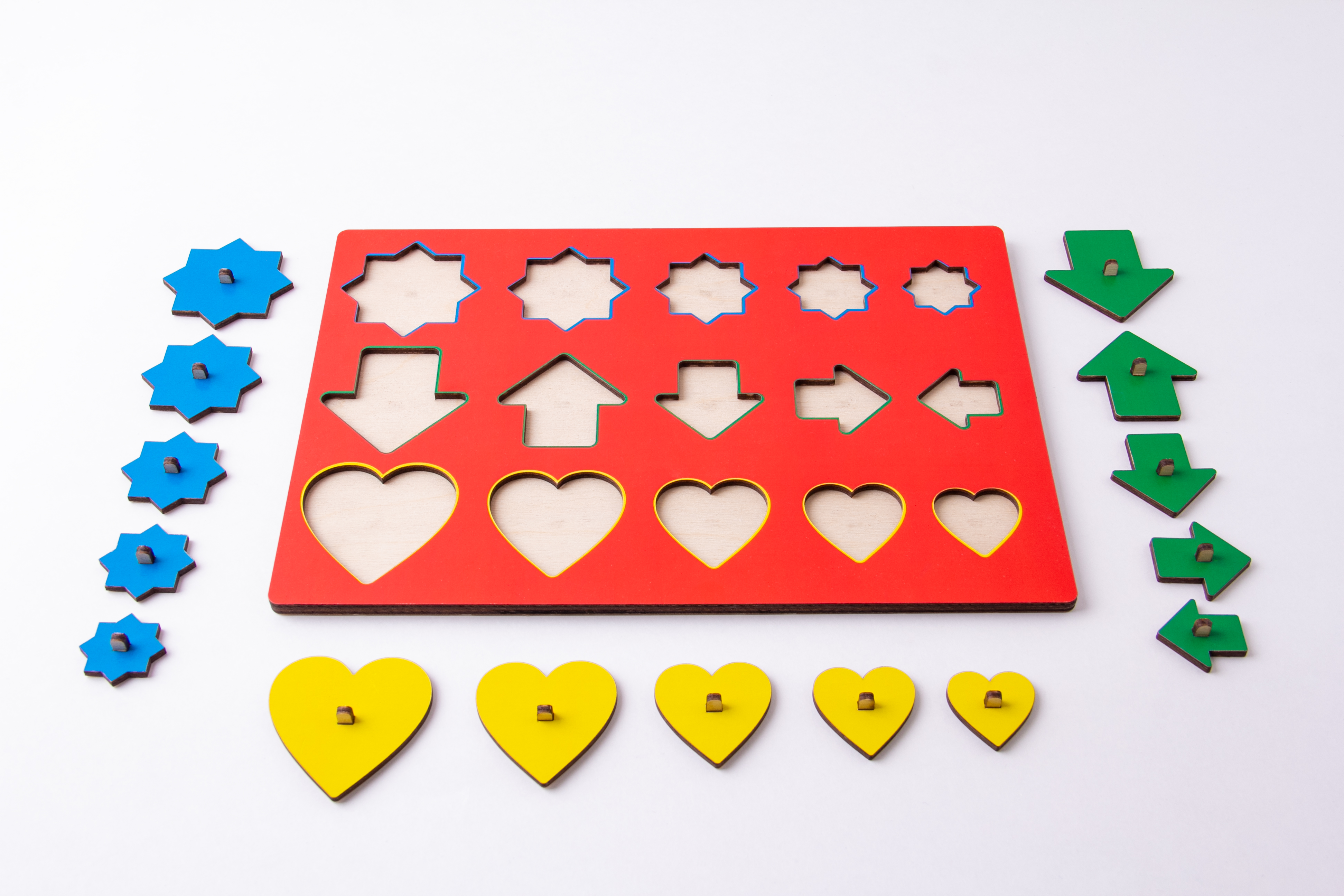 Деревянная панель с рамками – геометрическими фигурами– 1 шт. Панель содержит геометрические фигуры разных цветов и размеров с ручками.