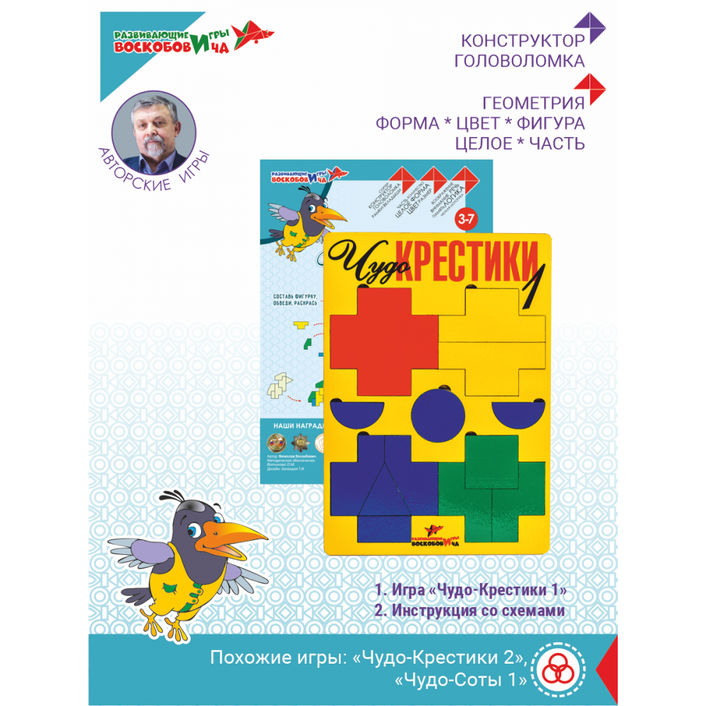 Конструктор «Чудо-Крестики 1» предназначен для изучения геометрических фигур, формирования логического мышления, математических понятий, пространственных представлений, развития сенсорных способностей (размер, цвет), творческого конструирования и мелкой моторики рук.