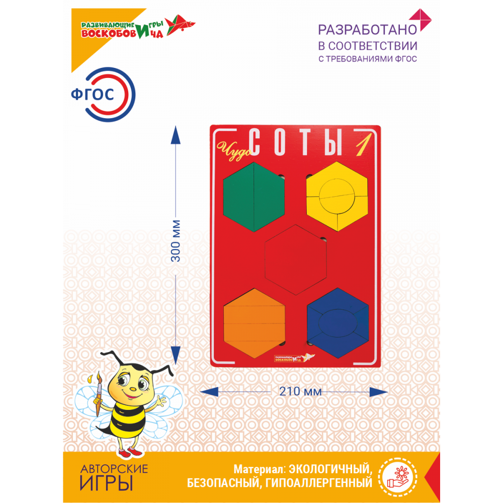 Рамка (210х297 мм) с выемками для деталей-вкладышей в виде сот (фанера 4 мм, цв. плёнка) – 1 шт. Элементы игры (соты): модуль – целая деталь красного цвета – 1шт.; составные элементы 2 части зелёного цвета; 4 части оранжевого цвета; 5 частей жёлтого цвета, 5 частей синего цвета – всего 17 шт.