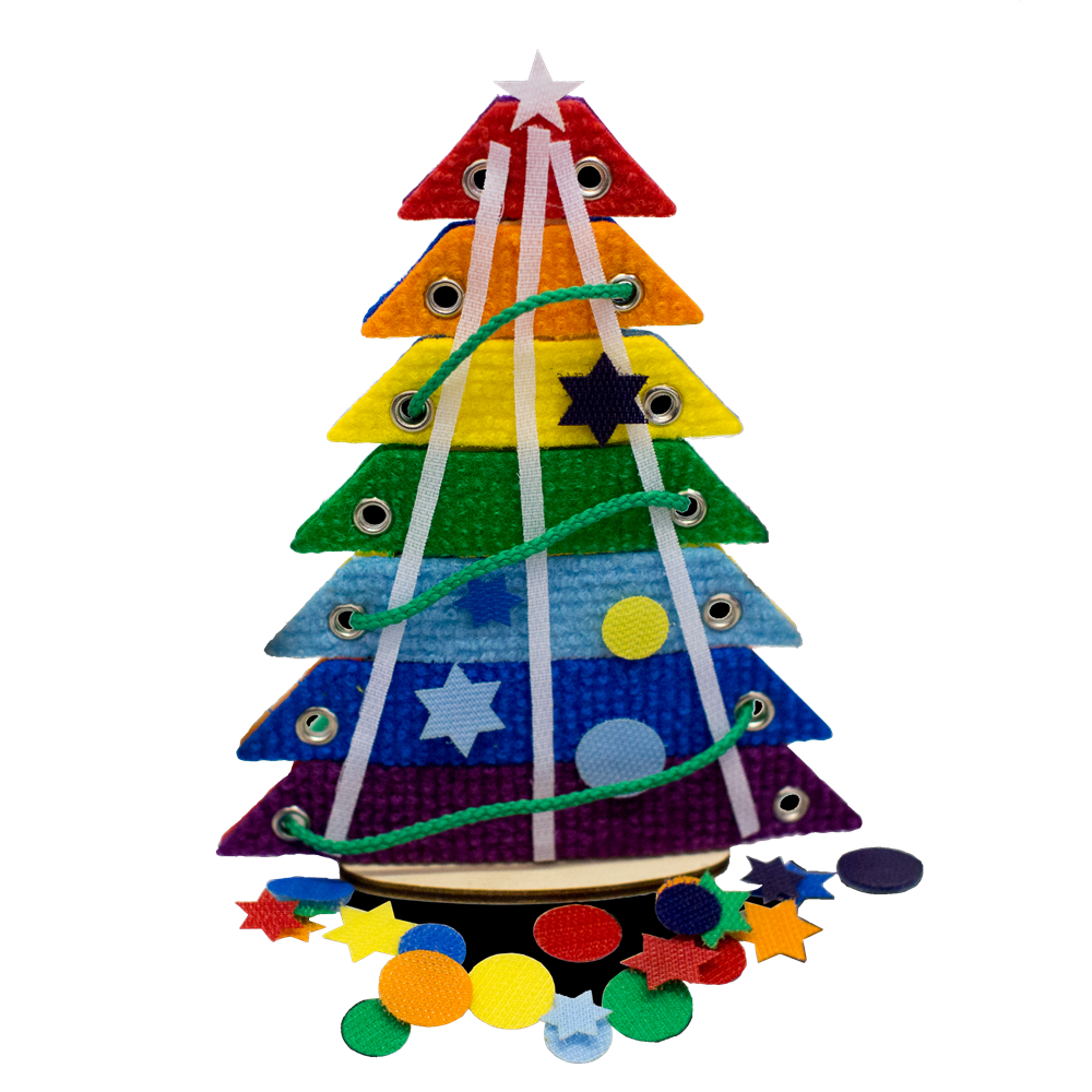 Состав: Инструкция; 2 шнурка; 28 липучек; елочка из 7 веточек - 18см3см; липкие веревочки; ось и подставка из фанеры. Размер: 26*15см.