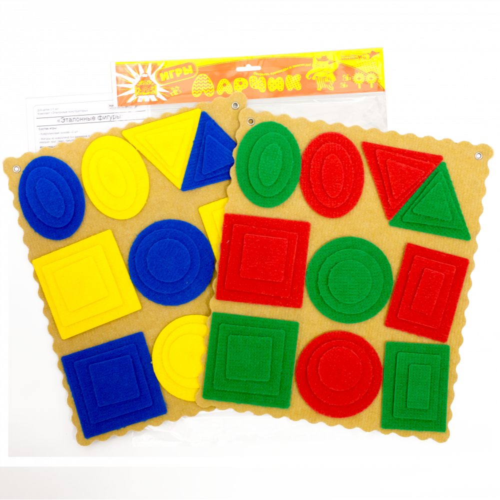 Состав: 1. Фигуры из ковролина 3-х размеров (сторона 100мм, 75мм, 50мм), 4 цветов (красный, желтый, зеленый и синий): - квадрат – 12 шт.; - круг – 12 шт.; - треугольник – 12 шт.; - прямоугольник – 12 шт.; - овал – 12 шт. 2. Ковролиновая основа – 2 шт.