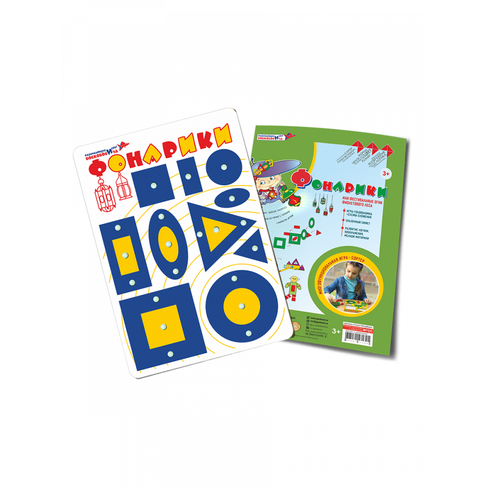 "Фонарики" - популярная игра-сортер и головоломка для самых маленьких. Собирая "фонарики", малыш запоминает формы, сравнивает размер, цвет, количество, подбирает заданные комбинации элементов. Сначала малыши составляют геометрические фигуры из двух частей одного цвета, играя в поле. Трехлетние дети конструируют из деталей головоломки фигурки по схеме и собственному замыслу, играя на столе.