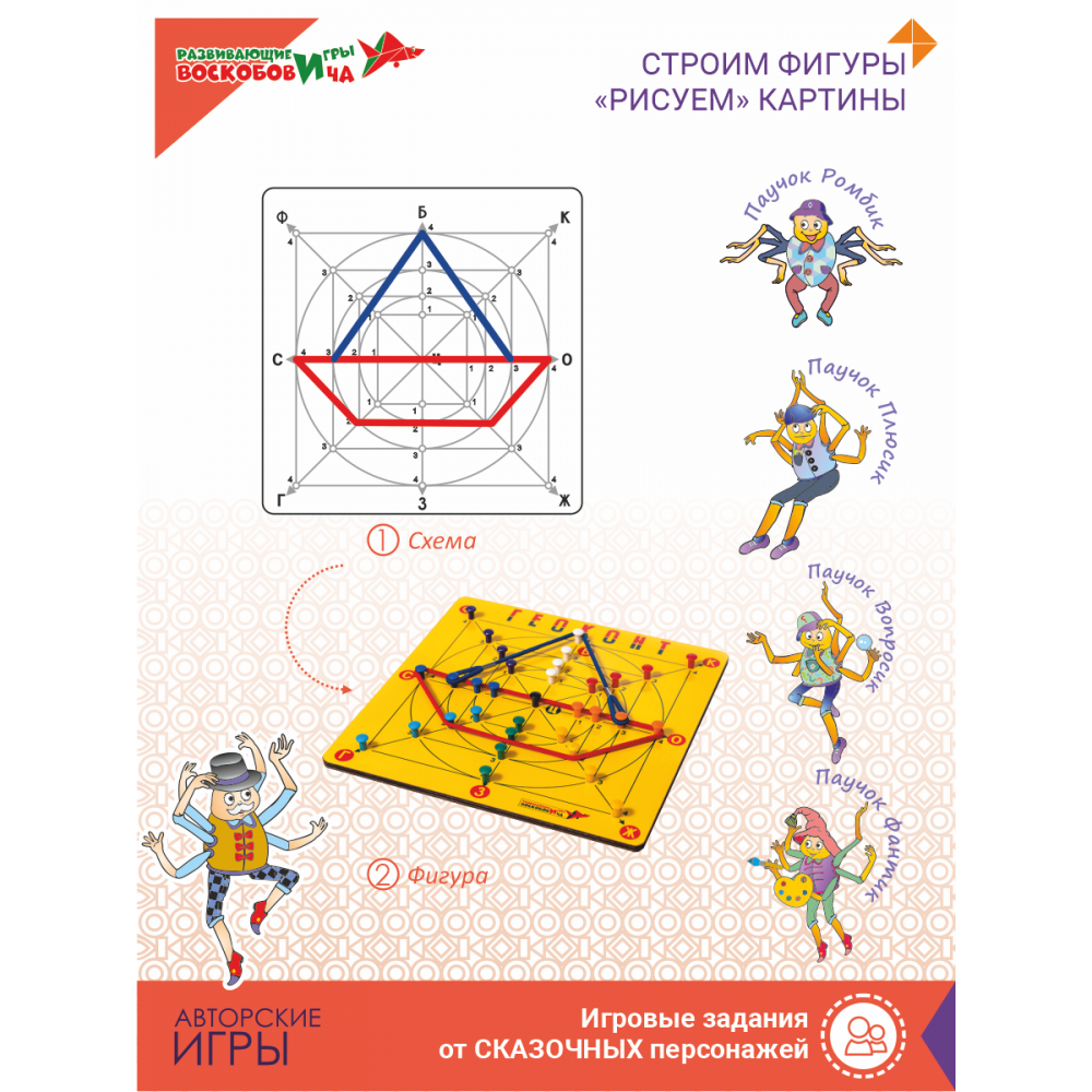 Развивающая пальчиковая игра предназначена для изучения геометрических фигур, развития пространственного мышления. Навыки конструирования формируются при помощи комплектующих компонентов: эластичных шнуров и плоскости системы координат.