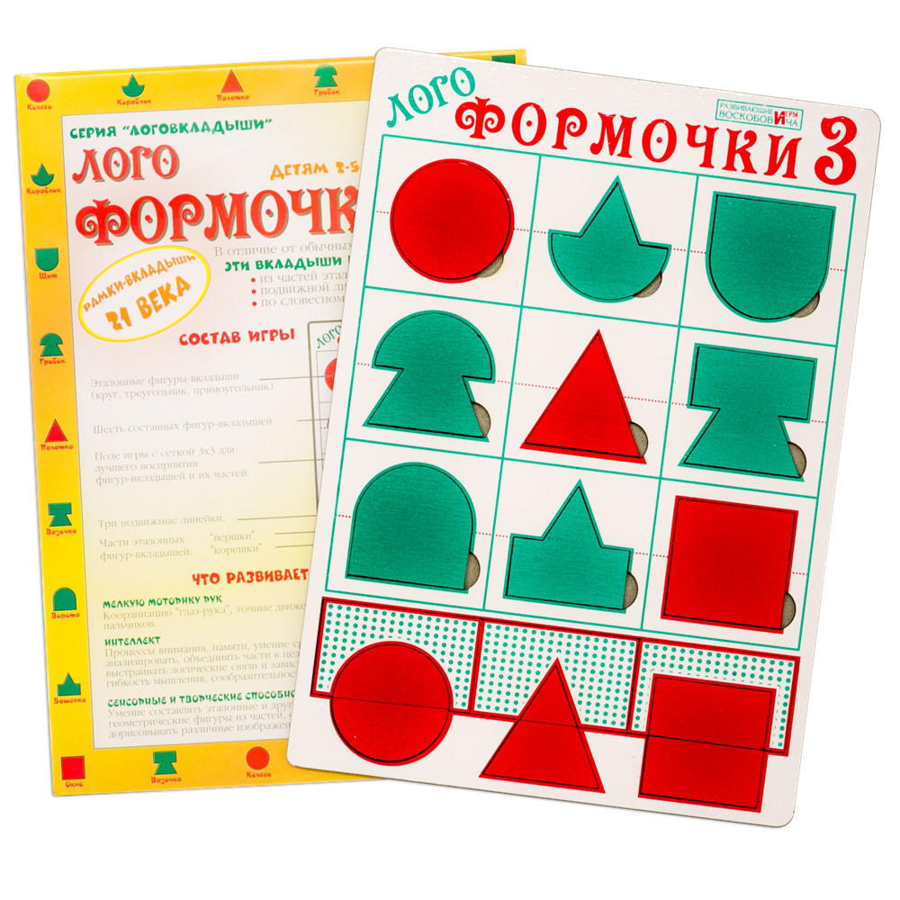 Состав: Игровое поле (210х297 мм, фанера, белая пленка, шелкография); фигуры-вкладыши (фанера, белая пленка, шелкография): 3 эталонные (круг, треугольник, квадрат) и 6 составных фигур, подвижная линейка, части эталонных фигур; инструкция.