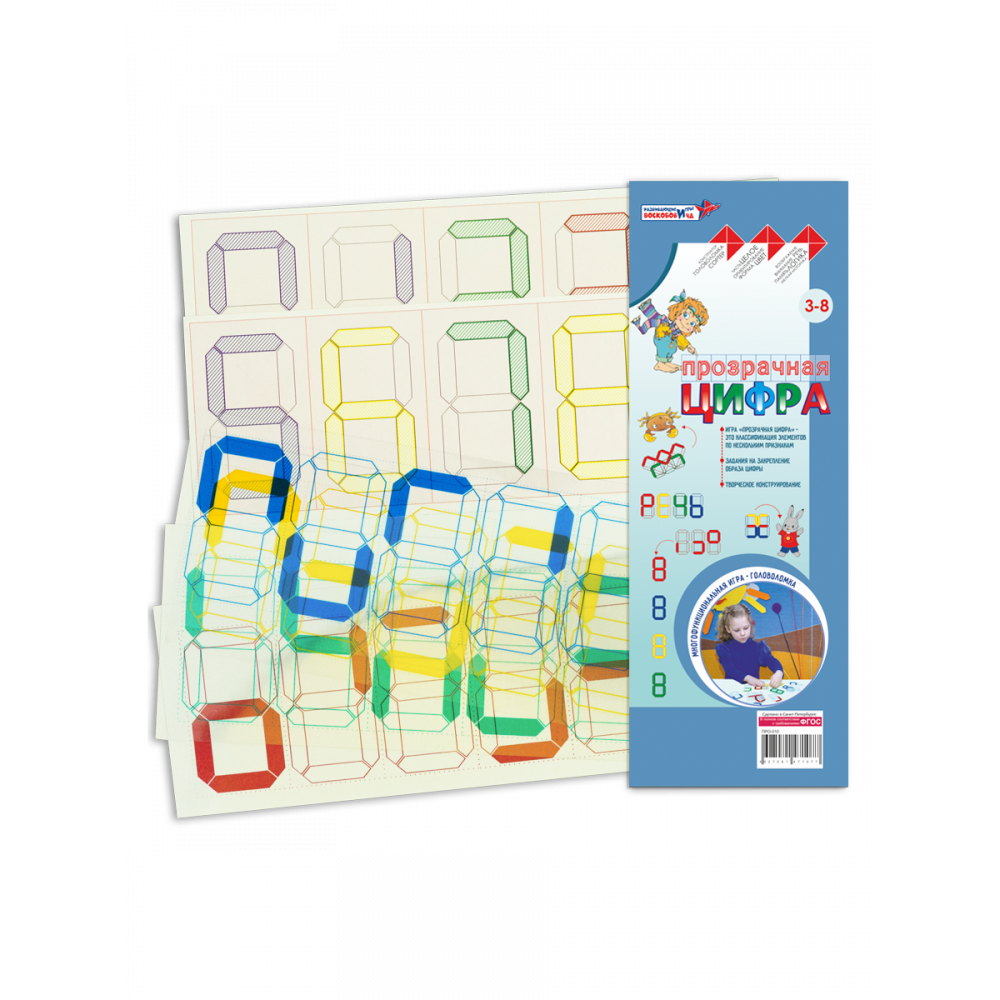 Состав: 24 пластинки на прозрачной пленке ПВХ (297х105 мм)с нарисованными цветными полосками в различном пространственном положении; карточки-трафареты с цветными цифрами от 0 до 9 (по принципу электронной восьмерки); инструкция.