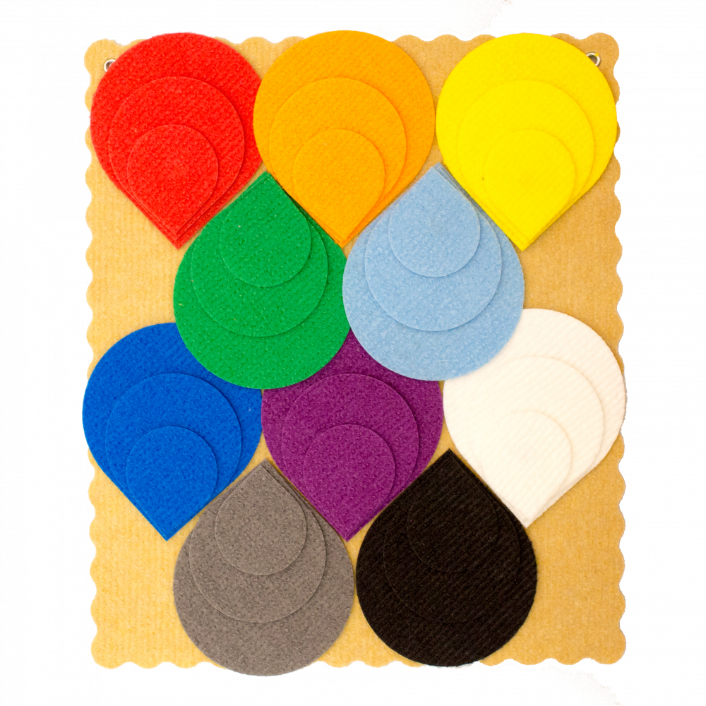 Состав: 30 «лепестков» (ковролин цвета радуги и белый, черный, серый) трех размеров; подложка (140х300 мм, ковролин); инструкция.