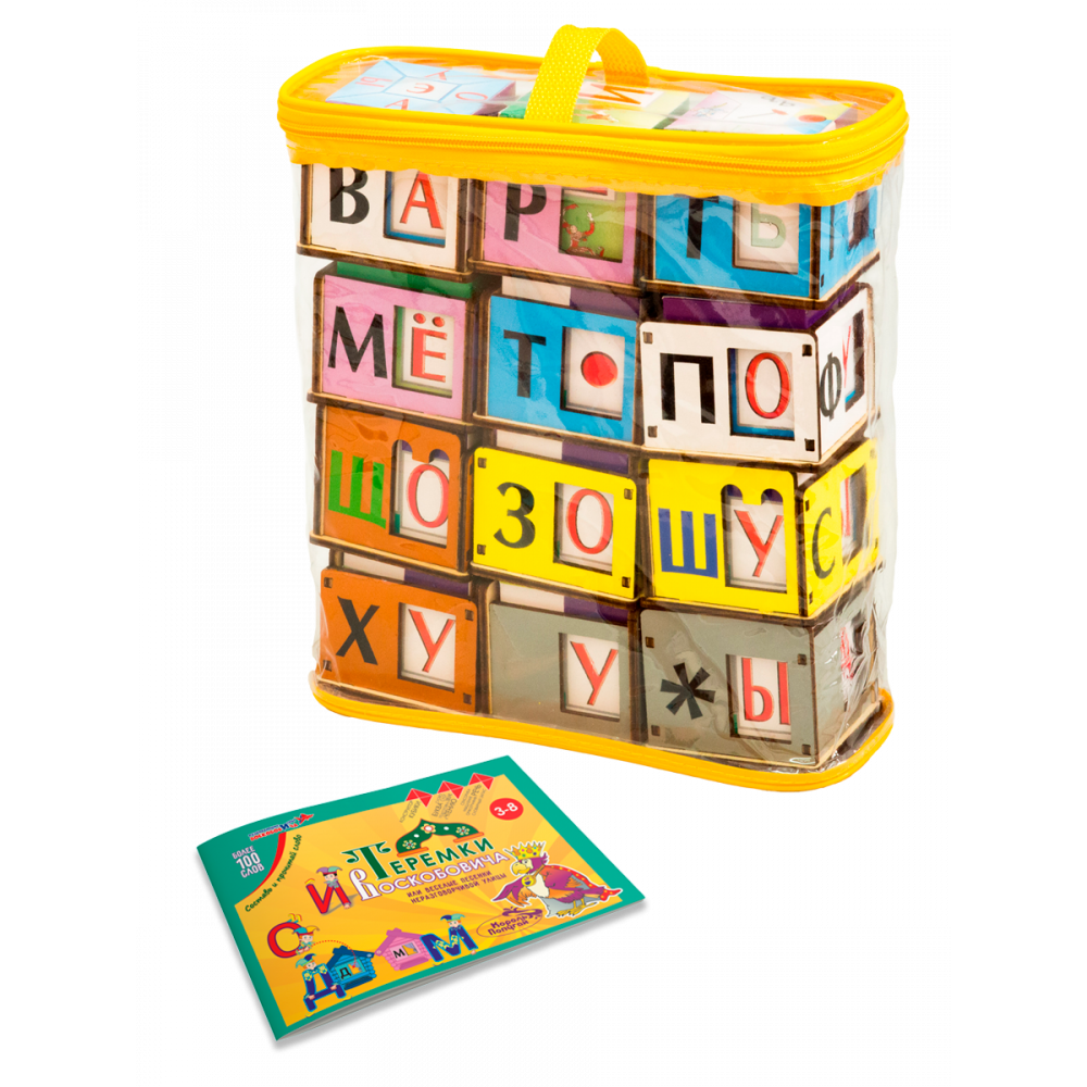 Состав: 12 кубиков-теремков (70х75х60 мм, фанера, цветная пленка) с согласными буквами черного, зеленого или синего цвета; 12 кубиков-вкладышей с гласными буквами (60х60х60 мм, картон, цветная печать); инструкция.