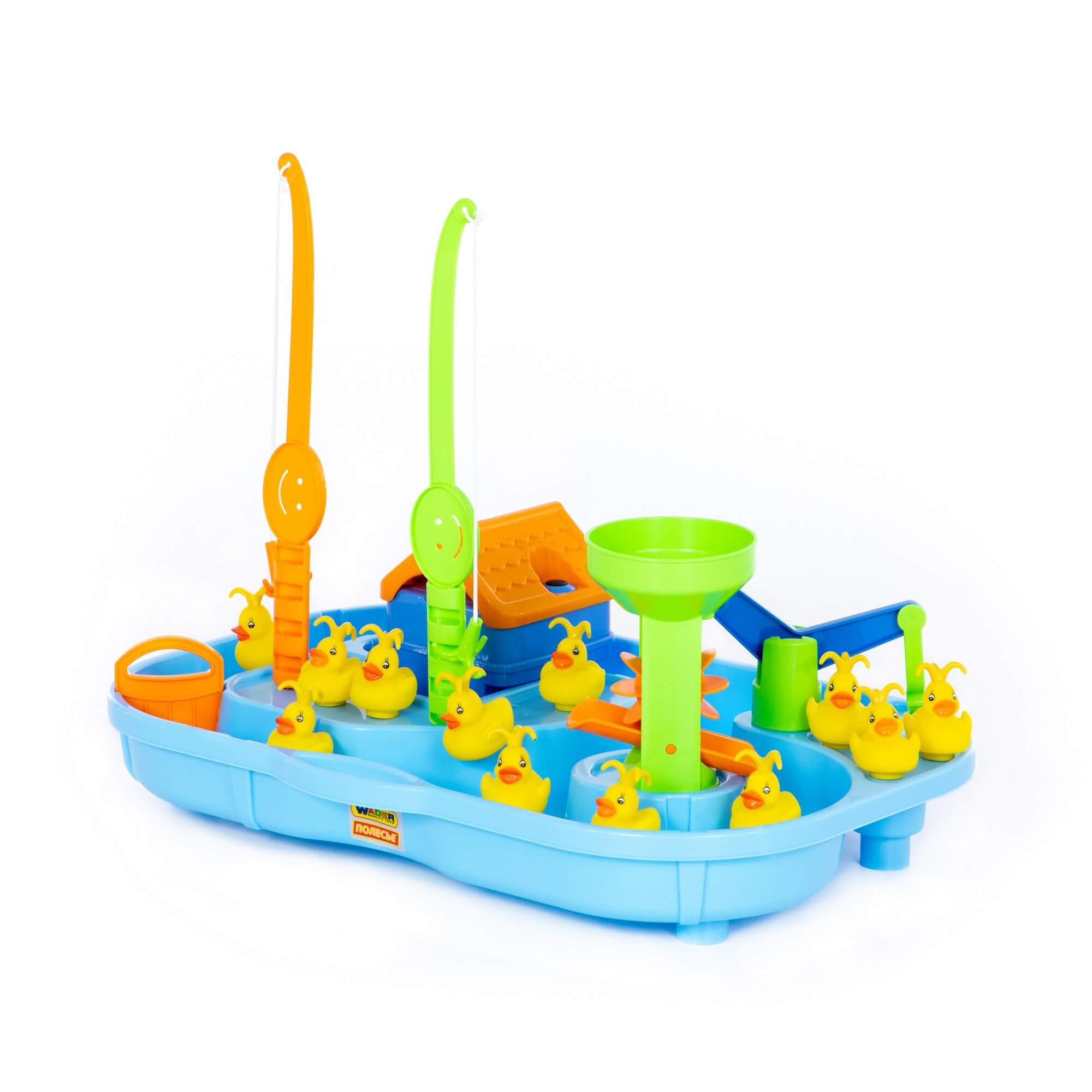 Всего в наборе 2 удочки и 12 уточек. Уточки при этом движутся в водичке от работы моторчика, который находится в домике. Включается моторчик путем нажатия кнопки на крыше домика. Также уточек можно ловить и подъемным краном. В наборе имеется водяная мельница, заслонки для воды.