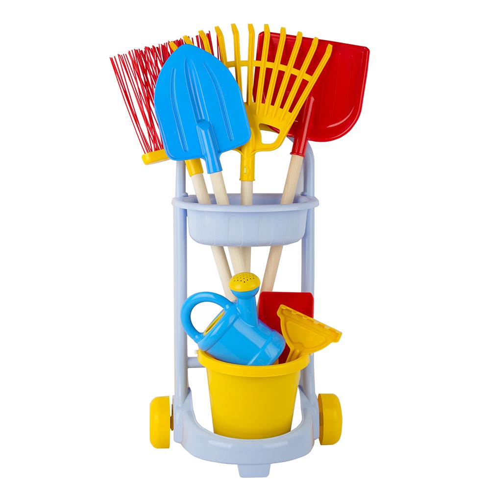 Комплектация : тележка, лопата совковая, лопата штыковая, грабли веерные, метла, лейка, совок, грабли, ведро.