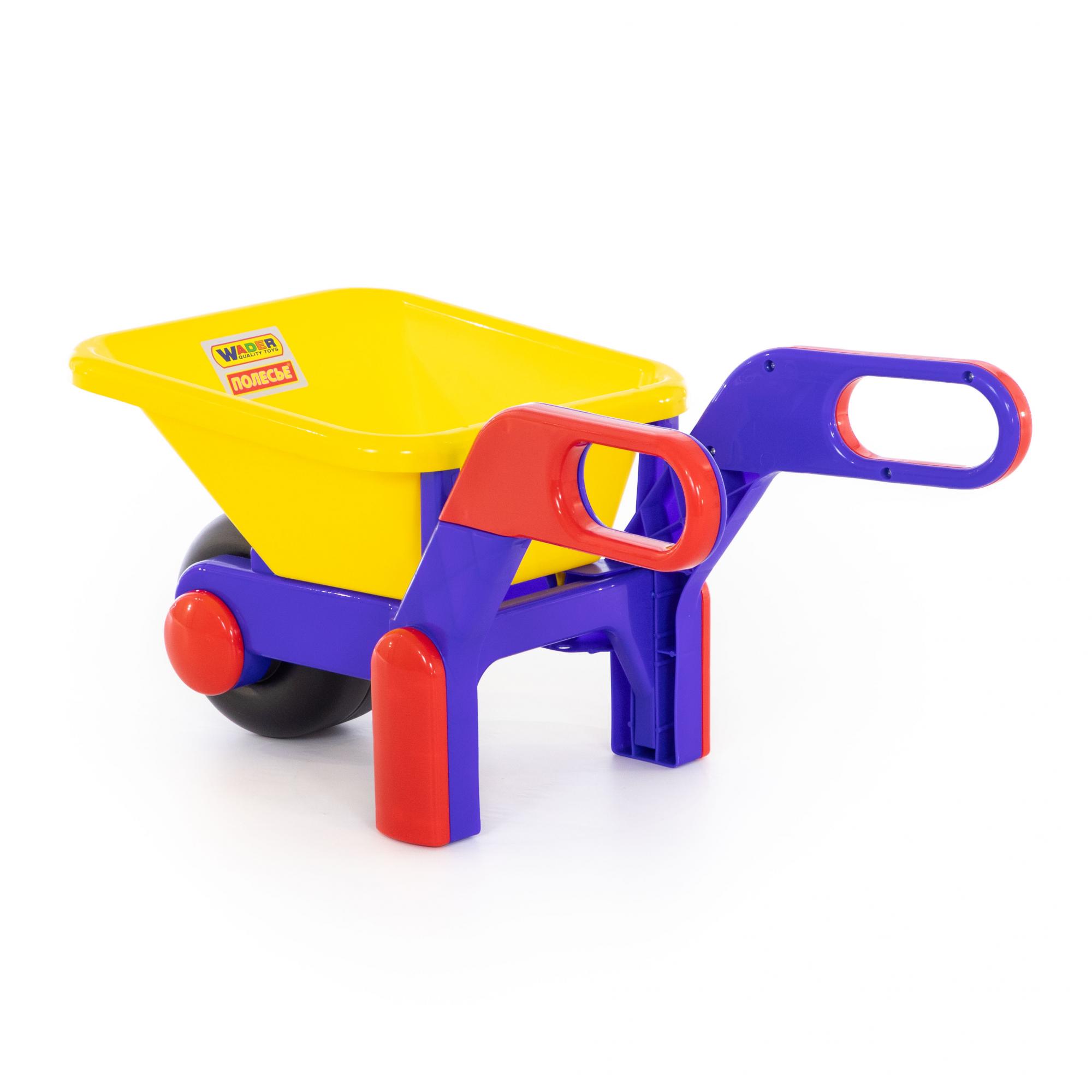 В пластиковой тележке отсек для перевозки различных материалов, ручки эргономичной формы, широкое колесо, а специальные опоры под корпусом позволяют игрушке находится в устойчивом положении во время загрузки.