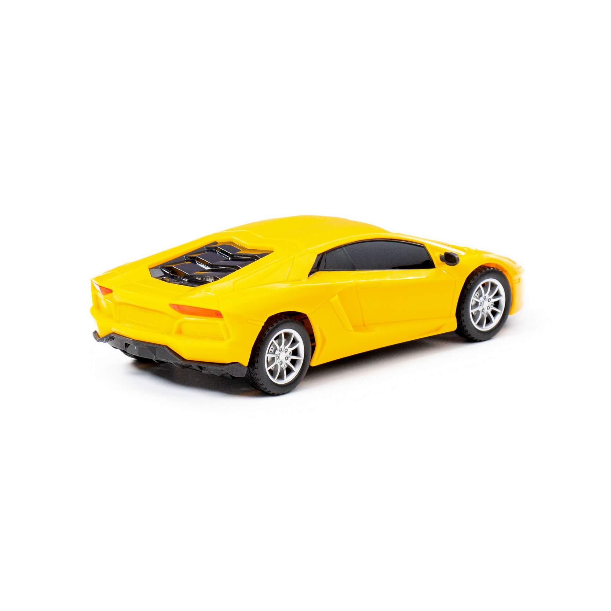 Конструкция автомобиля повторяет дизайн настоящих авто, позволяя ребёнку поближе познакомиться с транспортом. Игрушка выполнена в ярком жёлтом цвете, имеет тонированные чёрные стёкла, фары и резиновые колёса.
