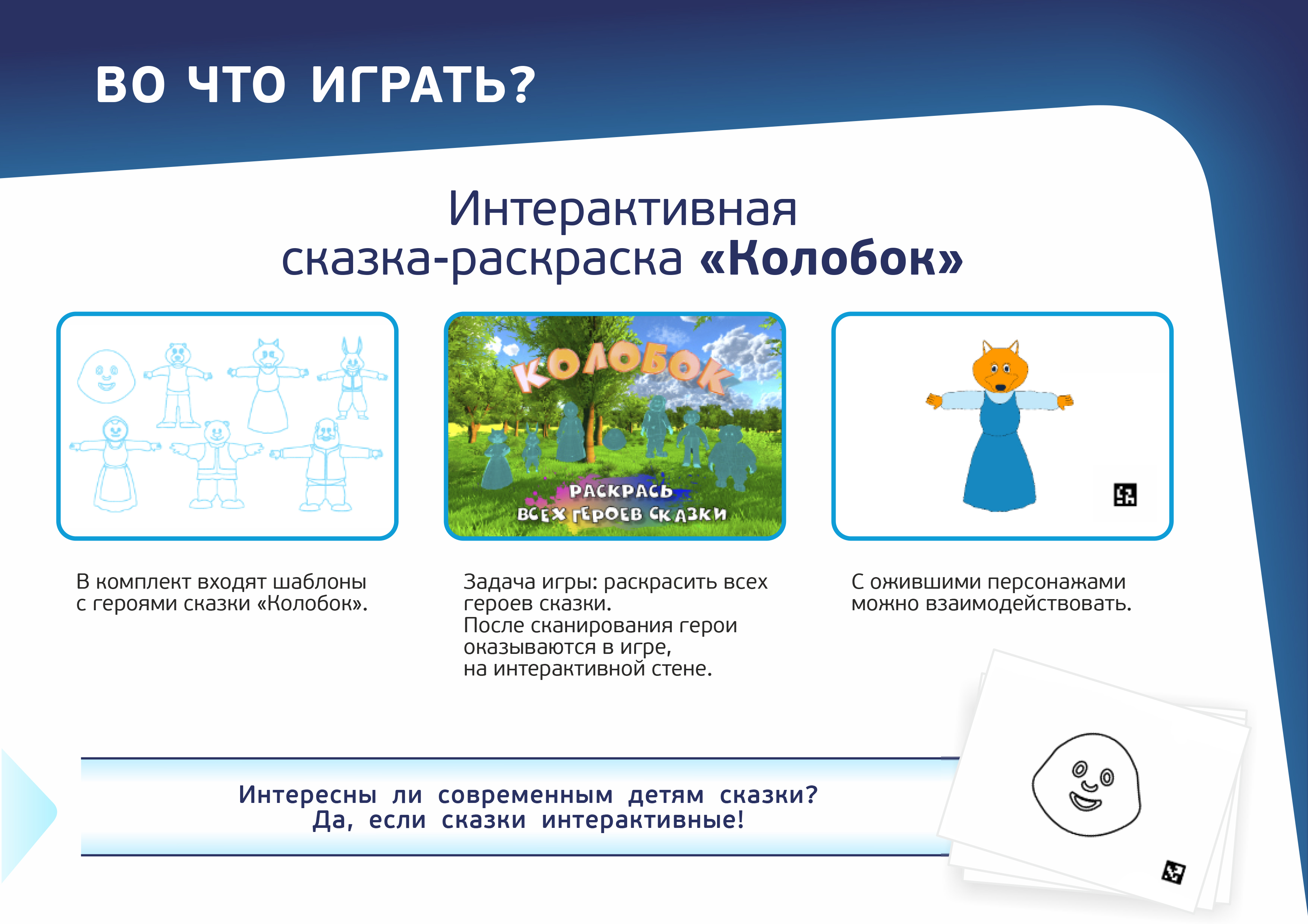 «Ожившие рисунки» — это творческая студия и интерактивный аттракцион в одном. Продукт создан для спокойных творческих занятий. Прекрасно подходит для зоны тихих игр. Дети раскрашивают шаблоны с персонажами игр, а после сканирования рисунки «оживают» — появляются на интерактивной стене, в игре. С ними можно взаимодействовать касаниями: рыбки будут стремительно уплывать, животные издавать звуки, самолеты и ракеты улетать, фигуры – менять траекторию движения. В каждой игре заложен определённый алгоритм действий. Подробнее